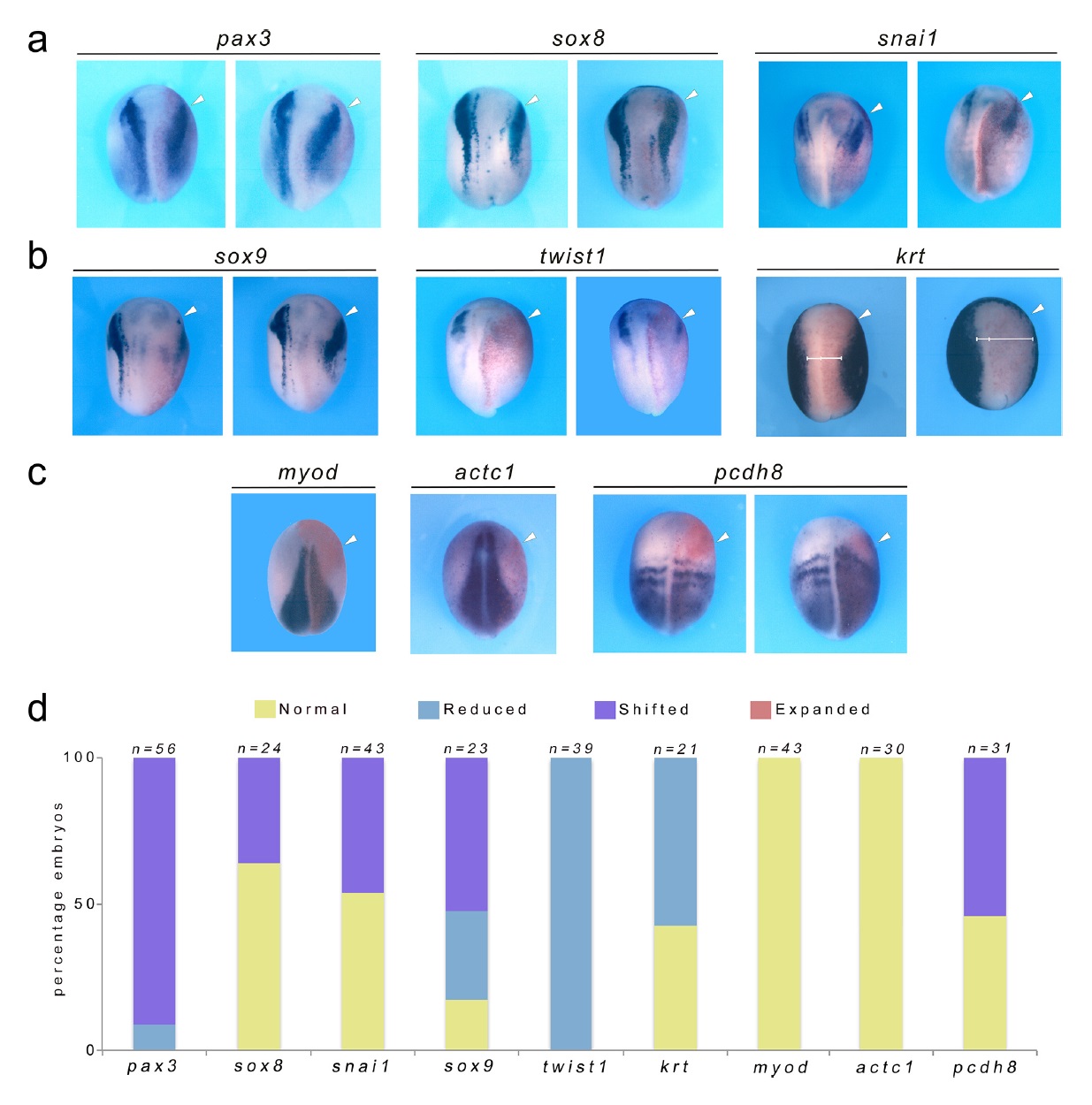 Figure 2. Dkk2 knockdown does not affect the expression of neural plate border specifiers and mesoderm formation. (a). Unilateral injection of Dkk2SMO (20 ng) did not affect the expression levels of pax3, sox8 and snai1, although their expression was shifted laterally. (b) The neural crest specifier twist1 was reduced, while sox9 expression was shifted laterally in most embryos. The epidermal marker, krt, was reduced in a pattern consistent with the expansion of the neural plate. (c) The expression levels of the mesoderm markers myod, actc1 and pcdh8 were unchanged in Dkk2- depleted embryos, although pcdh8 expression domain was shifted anteriorly in a subset of morphant embryos. (aâc) Dorsal views, anterior to top. (d) Quantification of the Dkk2SMO phenotype. The number of embryos analyzed (n) is indicated on the top of each bar. |