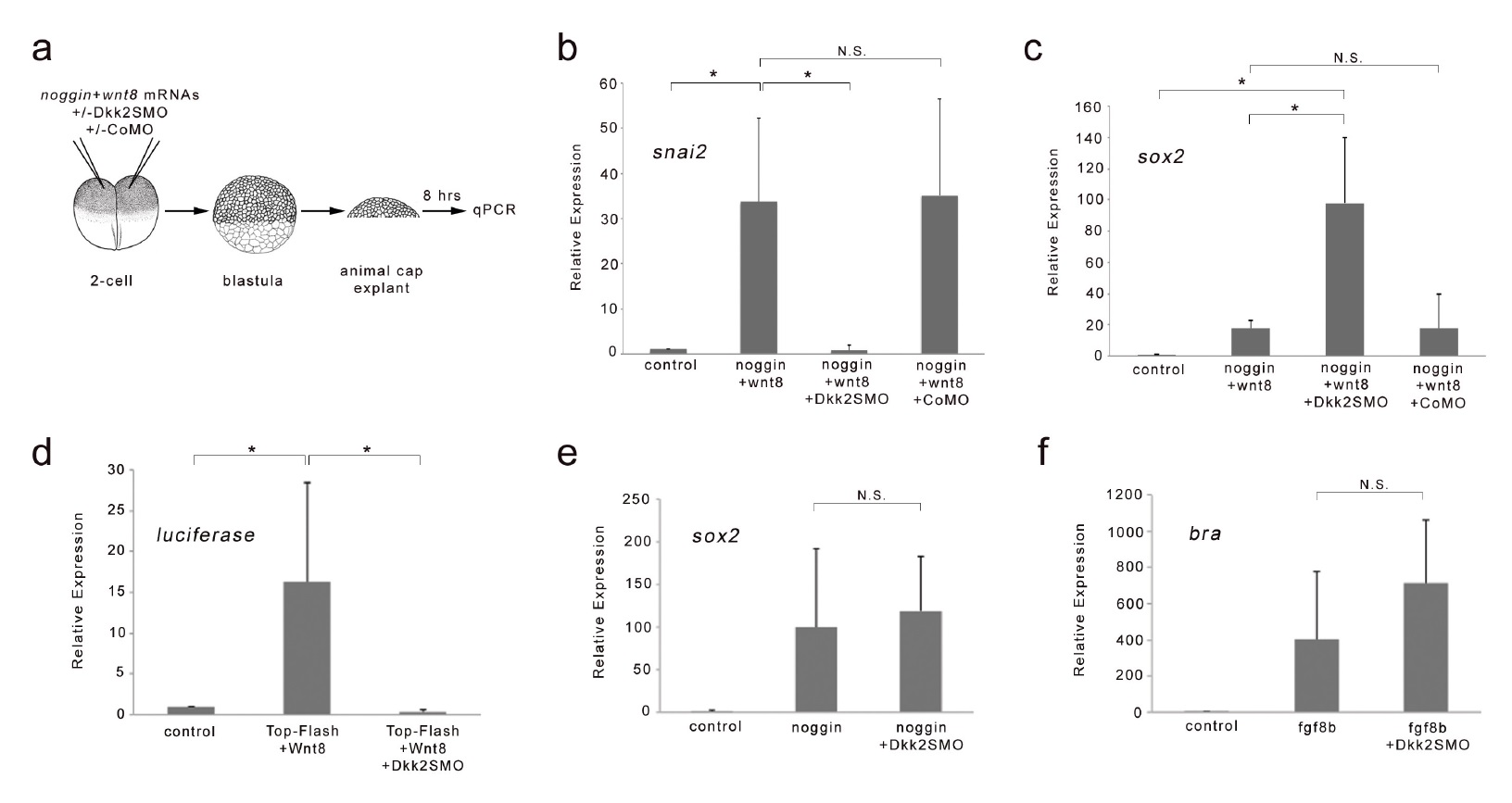 Figure 3. Dkk2 knockdown blocks neural crest induction by Wnt8 in neuralized animal cap explants. (a) At the 2 cell stage, mRNAs encoding noggin (50 pg) and wnt8 (100 pg) were injected in the animal pole region alone or in combination with Dkk2SMO (30 ng) or CoMO (30 ng). At the blastula stage (NF stage 9), animal cap explants were dissected and cultured for 8 hr and analyzed by qRT-PCR. (b–c) Attenuation of Bmp signaling in combination with Wnt8 induces snai2 expression. Dkk2SMO blocks snai2 induction by Wnt8 to promote neural plate fate (sox2 expression). A CoMO had no effect on the neural crest-inducing activity of Wnt8. (d) wnt8 (100 pg mRNA) expression activates a TOP-FLASH reporter (10 pg DNA) construct in animal cap explants, an activity that is completely blocked by Dkk2SMO coinjection (30 ng). (e) The induction of the neural plate gene sox2 by noggin (50 pg mRNA), and (f) the induction of the mesoderm gene bra by Fgf8b (100 pg mRNA) were unaffected by Dkk2SMO injection (30 ng). Graph represents mean ± s.e.m. of 3 independent experiments. *p<0.03; paired two tailed Student’s t-test. n.s. not significant. DOI: https://doi.org/10.7554/eLife.34404.008 |