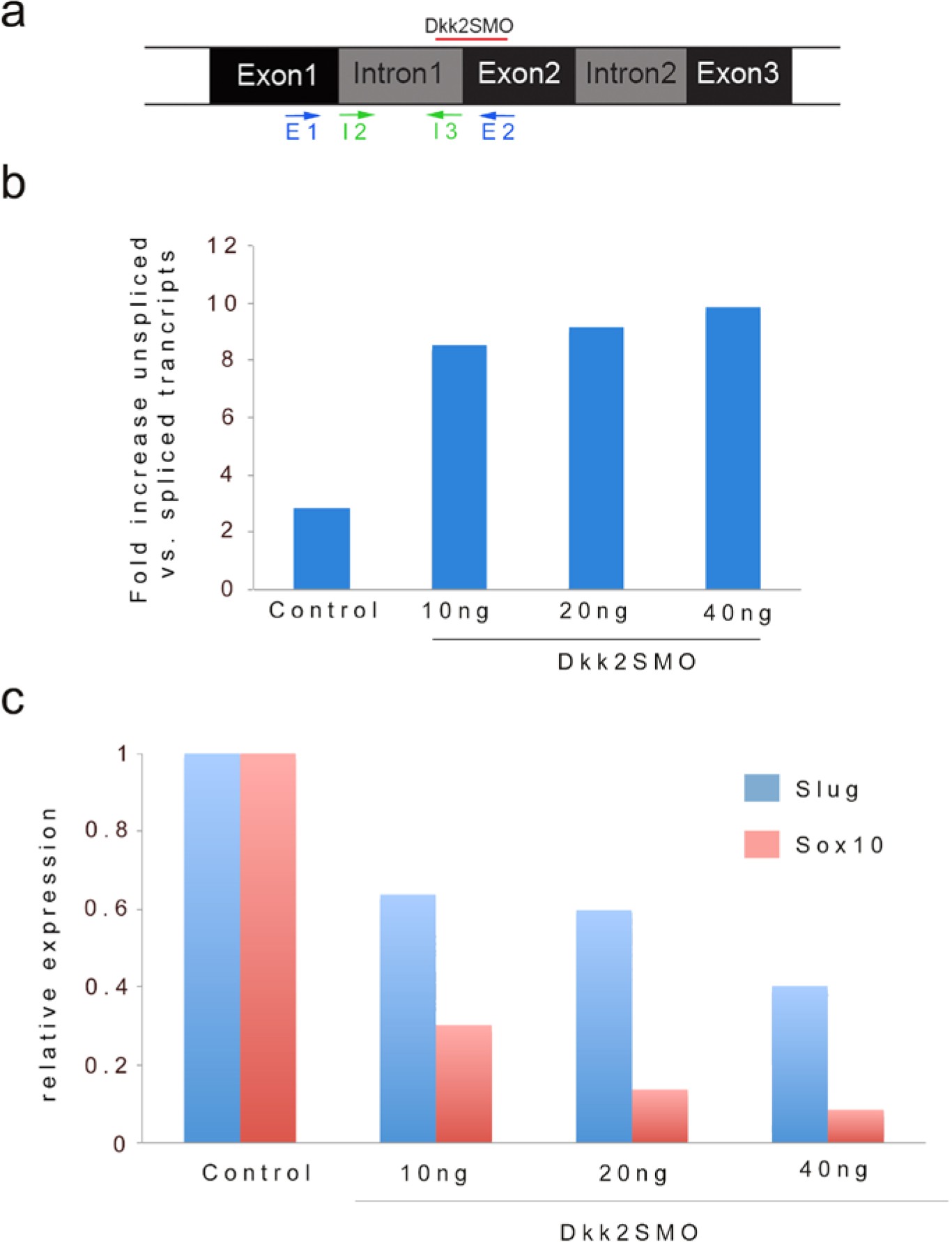 Figure 1—figure supplement 1 Quantification of unspliced vs. spliced transcripts in MO-injected embryos. (a) Schematic representation of the dkk2 locus. The position of the splice blocking MO (Dkk2SMO) is shown (red line). The PCR primers used to analyze the spliced (E1/E2) and unspliced (I2/I3) transcripts are indicated. (b) qRT-PCR analysis of fold increase in unspliced (intron one retention) vs. spliced transcripts upon injection of increasing doses of MO. (c) Increasing amount of MO resulted in a dose-dependent decrease in snai2 and sox10 expression in these embryos. A representative experiment is shown. |