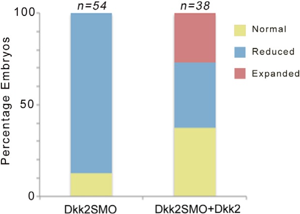 Figure 1—figure supplement 2 Dkk2 plasmid DNA injection rescues snai2 expression in morphant embryos. Injection of Xenopus Dkk2 plasmid DNA (10 pg) restores snai2 expression in Dkk2SMO-injected (30 ng) embryos. Results from two independent experiments. For the phenotype of Dkk2 gain of function see Figure 6. |