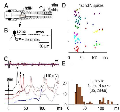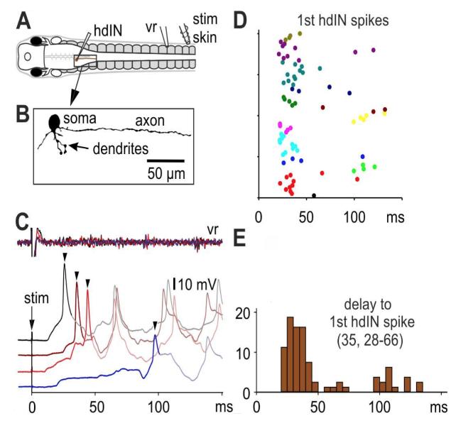 A, diagram to show the location of electrodes and the recorded hdIN neuron. B, anatomy of hdIN revealed by neurobiotin filling. C, examples of 4 hdIN responses to trunk skin stimulus. Arrowheads mark 1st spike. D and E, hdIN 1st spike time raster plot and 1st spike delays (n = 80 trials in 13 hdINs). |