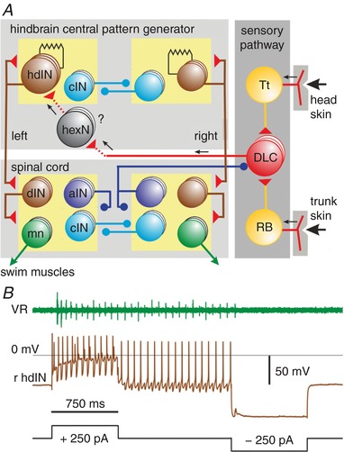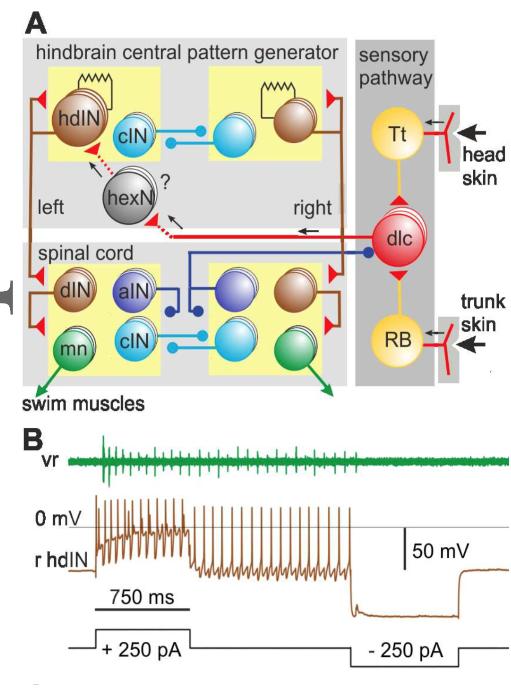 A, diagram of the touch sensory pathways to the opposite side from the head and trunk skin, and the hindbrain and spinal neurons controlling swimming. Tt, trigeminal touch sensory; RB, RohonâBeard touch sensory; DLC, dorsolateral commissural sensory pathway; hexN, hindbrain extension neurons; hdIN, hindbrain descending interneurons; cIN, reciprocal inhibitory commissural interneurons; aIN, recurrent inhibitory ascending interneurons; mn, motoneurons. Red triangles are glutamatergic excitatory synapses. Blue circles are glycinergic inhibitory synapses. Synapses onto a box connect to all neurons in the box. B, recording from a right hdIN where activity in the whole swimming network (seen in left ventral root (VR): green trace) could be initiated by positive current and terminated by negative current into this single neuron. The right hindbrain was transected just caudal to the otic capsules (see Fig. 1