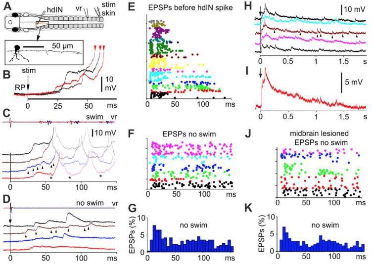 Figure 5. Summation of EPSPs to firing threshold in reticulospinal hdINs following a trunk skin stimulus on the opposite side. A, Neurobiotin fill of the neuron in the left caudal hindbrain recorded in B-D. (Box location as in Fig. 4A.) B, Three superimposed responses (from C) to contra-lateral stimuli evoking swimming show the noisy rise of excitation towards spike threshold (spike onsets marked by red arrowheads). C, D, Recordings show variability in EPSP summation in responses to trunk skin stimulation just above C and below D swim threshold (see ventral root vr). Arrowheads mark example EPSPs and responses are offset for clarity. Asterisks mark artifacts due to spikes in another hdIN recording electrode on the other side. E, F, Raster plots of EPSP latencies in response to skin stimuli at t = 0 where each colour is a different hdIN and each row is a different response. E, EPSPs up to the time of the first hdIN spike of swimming (14 hdINs). F, EPSPs to stimuli below swimming threshold (6 hdINs), persist for more than 150 ms after the stimulus. G, EPSP latency distributions for responses in F. H, Slower time scale recordings show long duration of responses below swim threshold. Arrowheads mark example EPSPs. I, The long duration of the excitation is clear from an average of the 5 responses in H. J, K, Raster plots and distributions of EPSP latencies (like F, G) in animals with the midbrain removed. |