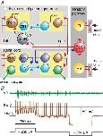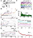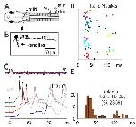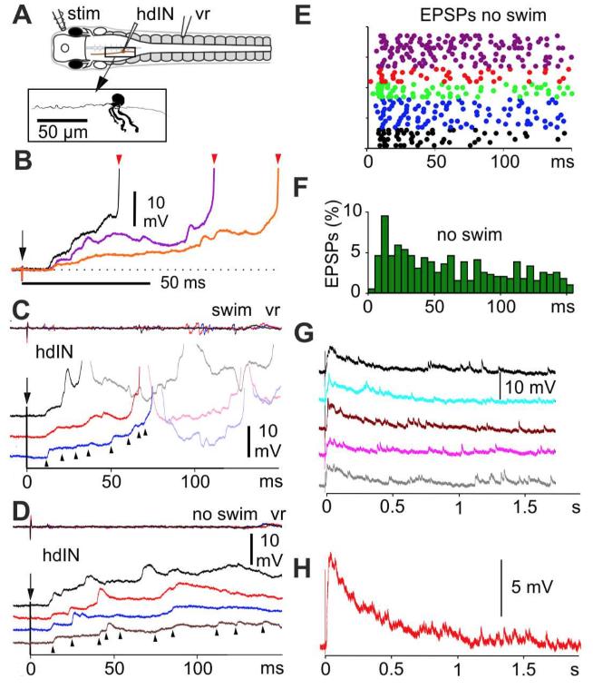 Figure 6. Summation of EPSPs to firing threshold in reticulospinal hdINs following a head skin stimulus on the opposite side. A, Diagram to show the location of electrodes. The inset is the hdIN neuron recorded in C, D. B- C, Responses of hdINs to head skin stimulation (at arrow). B, Three superimposed responses from different neurons leading to firing (red arrowheads). Dots show resting potential. C, D. Responses of hdIN in A to stimuli above (C) and below (D) threshold for the hdIN spike and swimming (see top vr traces). (C, D) Arrowheads mark example EPSPs. E, Raster plot of EPSP latencies from 5 hdINs (different colours) over the first 150 ms after the stimulus when swimming did not occur. F, EPSP latency distributions for responses in E. G, Slower time scale recordings of responses below swim threshold show the prolonged responses in another hdIN. H, An average of responses in G. |