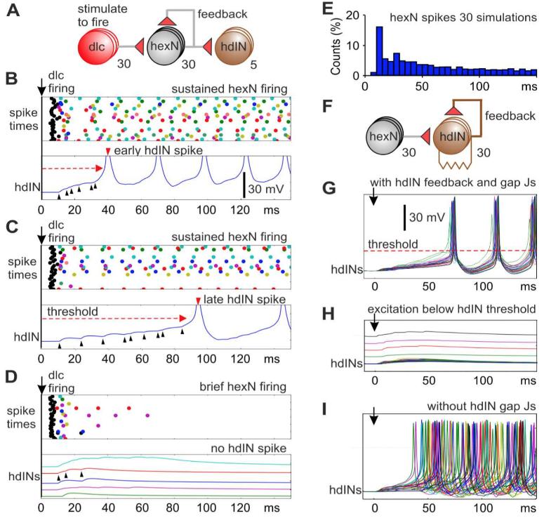 A, recurrent hexN network excited by single spikes in 30 sensory pathway DLCs with 5 hdINs to monitor output. BâD, responses to 30 DLC spikes. Raster plots show spike times for DLCs (black) and hexNs (colours); stimulus to DLCs at arrow. Lower panels show selected hdIN voltage records. The hexNs produce variable, summating EPSPs in hdINs (black arrowheads). EPSP summation can reach threshold (dashed red line) and lead to hdIN firing (red arrowhead) after variable delays. D, when hexN firing is brief, EPSPs sum but do not reach hdIN firing threshold (all five traces separated for clarity). E, histogram of all hexN firing times in 30 trials of a single network. F, model of a population of 30 hdINs with electrical coupling and feedback glutamate excitation (Hull et al. 2015) excited by hexN spikes at times determined by the hexN recurrent network model. GâI, overlapped voltage records of all 30 hdINs in response to hexN excitation in one trial. G, excitation can sum to threshold so hdINs are recruited to spike rhythmically and almost synchronously. H, in another trial the EPSPs sum but do not reach hdIN firing threshold (some traces separated for clarity). I, without electrical coupling, hdINs fire earlier and then asynchronously. All voltage scales as in B and G. |