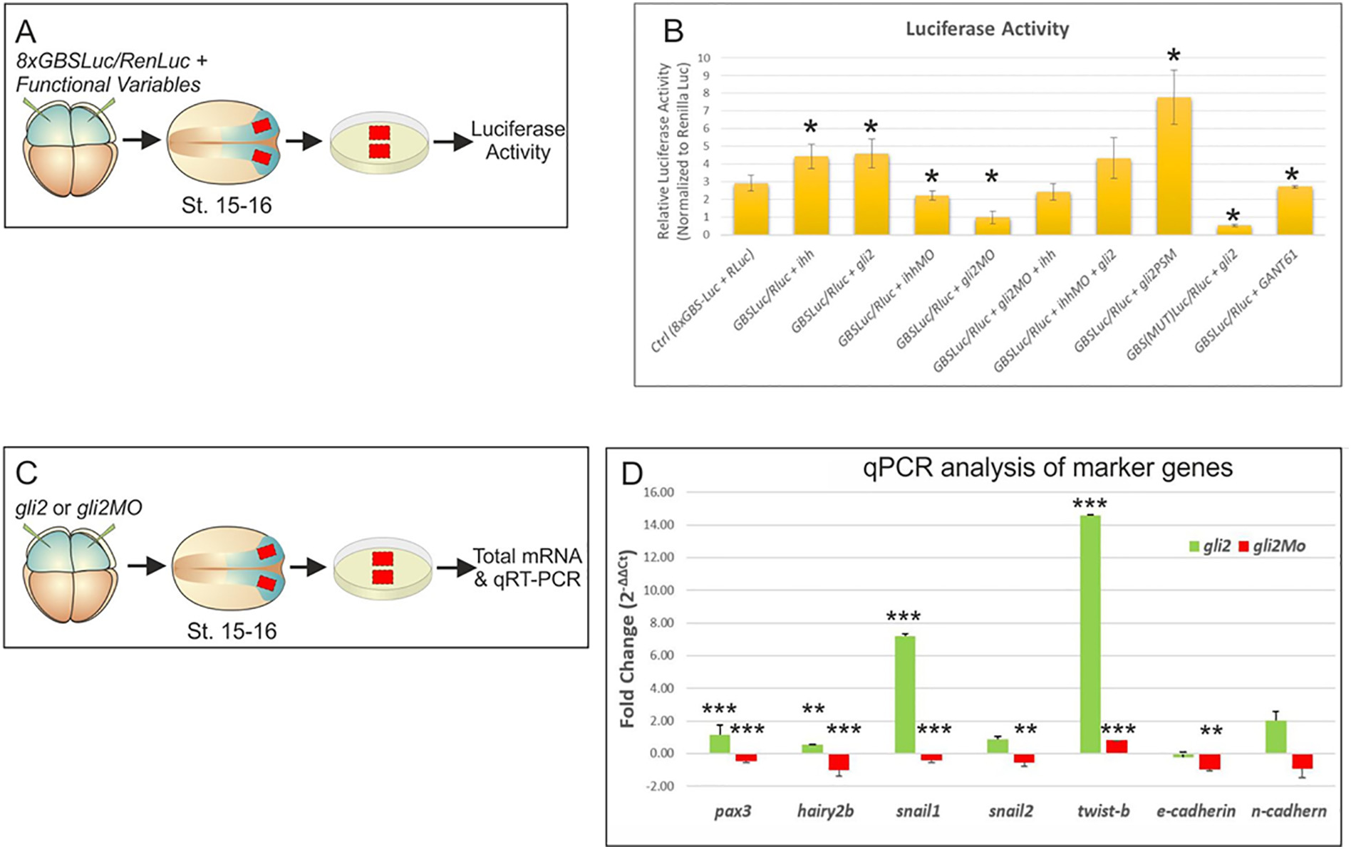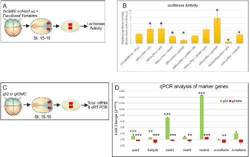 Fig. 6. gli2 acts through a transcriptional activation mechanism and affects the expression of several NC markers. (AâB) Gli-Luciferase reporter assay. (A) Schematic representation of the Luciferase assay experiment. (B) Transcriptional activity of Gli2 in NC explants. Intensities are shown as relative units of Luciferase normalized to the internal control Renilla Luciferase. An increase in Gli2 and Ihh function increases the expression of the Gli-dependent reporter construct. (C-D) RT-qPCR analysis of Gli2 function on the expression of NPB and NC markers. Each color coded bar represents the relative expression level of the markers for each condition (gain and loss-of-function of gli2). All the expression levels denote Ct values that were normalized first to the expression level of gadph, and then they were normalized to the expression of each gene in the uninjected wildtype condition, and are presented as fold change. (C) Schematic representation of the grafting experiment. At stage 15â16 total RNA was isolated and then RT-qPCR was performed. (D) Expression levels of the markers pax3, hairy2b, snail1, snail2, twist-b, e-cad and n-cad. Data are presented as meanâ¯Â±â¯s.d. of triplicates of two independent qPCR experiments. Reference: **, Pâ¯<â¯0.05; ***, Pâ¯<â¯0.001 (P-values correspond to Student's t-Test). |