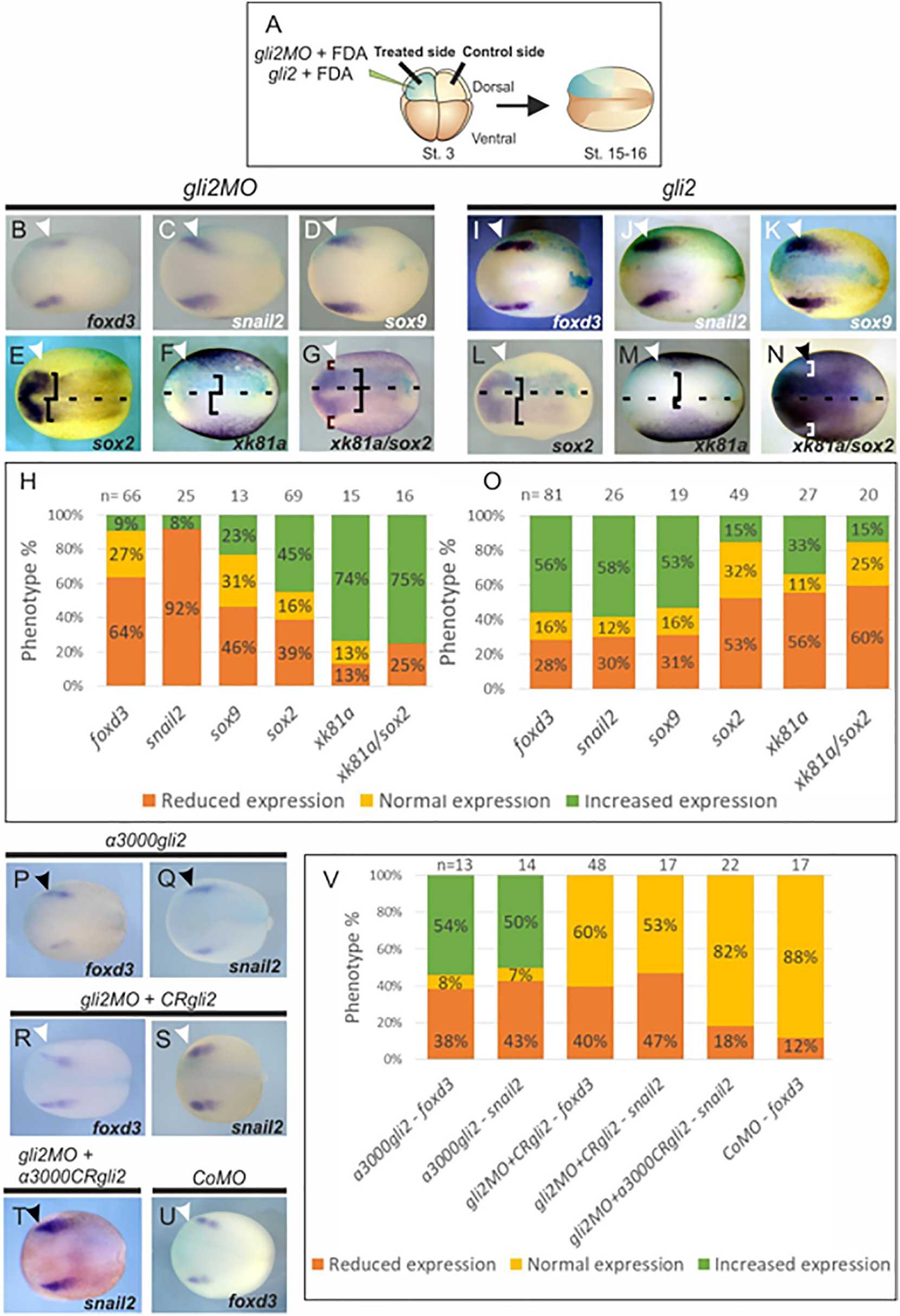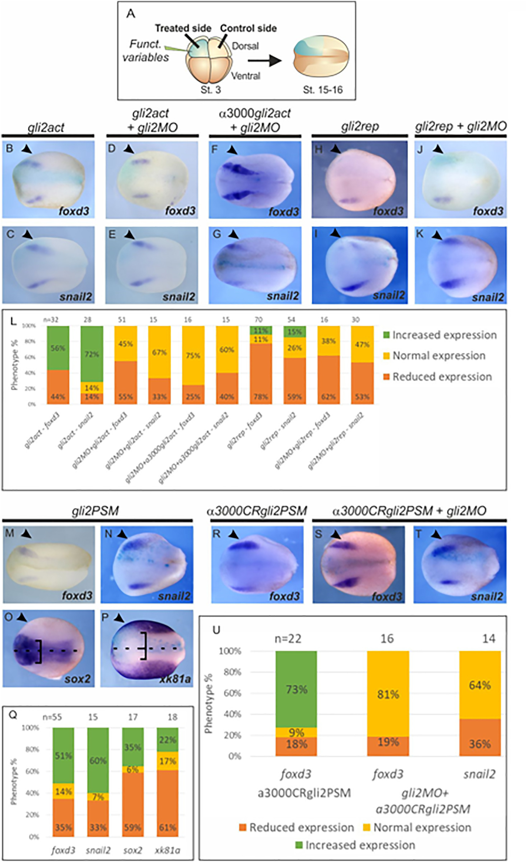 Fig. 5. The activator form of gli2 is required for NC specification. (A) Schematic procedure of the experiments. (BâK, MâP, RâT) Dorsal views of Xenopus laevis embryos at mid-neurula stage, anterior side to the left. Arrowheads indicate the injected side, shown in turquoise. (BâC) gli2act increases the expression of foxd3 and snail2. (D-G) gli2act and α3000gli2act are able to rescue the expression of foxd3 and snail2 in the morphant embryo. (HâK) gli2rep represses the expression of foxd3 and snail2 and therefore is not able to rescue these expressions in the morphant embryo. (L) Quantification of effects shown in BâK. (MâP) The phosphorylation mutant gli2PSM increases the expression of NC markers and represses the activity of sox2 and xk81a. (R-T) The α3000gli2PSM construct also increases the expression of foxd3 and is able to rescue the effects of gli2MO. (Q, U) Quantification of the experiments shown in MâP and RâT, respectively. |