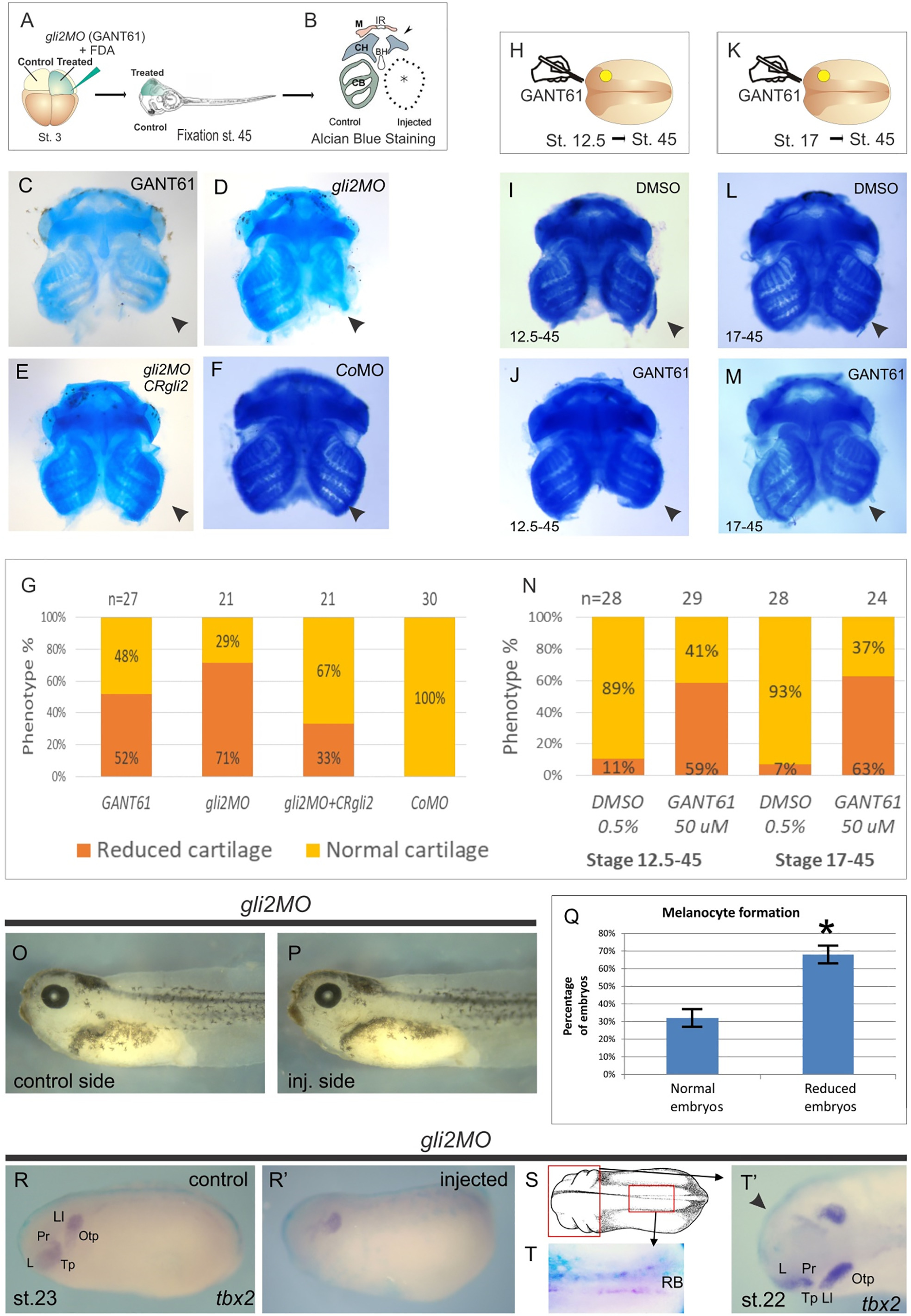 Fig. 9. gli2 is required for the proper formation of NC derivatives. (A, H, K) Schematic representation of the experiments performed. (B) Diagram indicating the different components of the craniofacial cartilages. (CâF, IâM) Craniofacial cartilages preparation of stage-45 tadpoles. Alcian blue staining, ventral views of embryos, anterior side is at the top. Injected side is indicated by arrowhead. (C) GANT61 injection at stage 3 produced a reduction in craniofacial cartilages, with a more prominent phenotype in the ceratobranchial cartilage. (D) The gli2MO-injected side of embryos (arrowhead) presents a marked reduction in Meckel's, ceratohyal and ceratobranchial cartilages. (E) Rescue of cartilage morphology after coinjection of CRgli2 along with gli2MO. (F) CoMO-injected embryos showed no effect on the treated side. (G) Quantification of phenotypes shown in CâF. (HâN) Grafting of GANT61-soaked beads at two different time frames (st. 12.5 to 45 and 17 to 45) produced a consistent reduction in craniofacial cartilages. (OâQ) Lateral view of a gli2MO injected embryo. On the injected side there is a reduction in the number of melanocytes in the zone of the future gut. Quantification is shown in Fig. 9Q. (RâT) tbx2 expression shows a reduction in RB neurons and cranial ganglia primordia on the gli2MO injected side. Pr, profoundal placode; L, lens placode; Ll, lateral line placode; Tp, trigeminal placode; RB, Rohon-Beard sensory neurons.