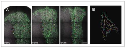 Figure 2—figure supplement 1. In vivo imaging of cell trajectories in the closing neural tube. Three successive still images from the time-lapse movie shown in Figure 2 and Video 1 with a subset of cells labeled with membraneGFP and H2B-RFP being tracked. Scale = 200 mm. The far right panel shows the overall trajectories of the tracked cells through the duration of the tracking interval (4 hr, 16 min). DOI: https://doi.org/10.7554/eLife.36456.008 |