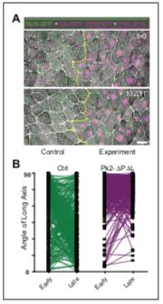 Figure 4âfigure supplement 1. A dominant negative Pk2 disrupts polarized cell rearrangements. (A) Confocal images from a Xenopus neural plate at stage 12.5 (top) and stage 14 (bottom) evenly labeled with Myl9-GFP and Utrophin-RFP (actin biosensor), but mosaically co-expressing H2B-RFP (magenta nuclei) together with Pk2-DPDL on one side (right). Scale = 20 mm. (B) Plot of the angle of the long axis of control and Pk2-DPDL-expressing cells at Stages 12â12.5 (early) and Stages 13â14 (late), with lines connecting angles of the same cell at the two different time points. All measurements are from different regions of embryos that mosaically express Pk2-DPDL, similar to as shown in (A). n = 144 control cells and 143 Pk2-DPDL- expressing cells from 4 embryos across three experiments. DOI: https://doi.org/10.7554/eLife.36456.013 |