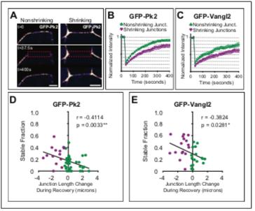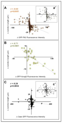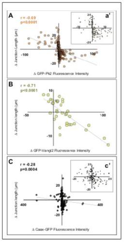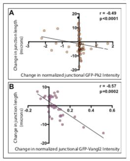 Figure 6—figure supplement 1. PCP protein localization is correlated with junctional behavior. (A) Plot of normalized GFP-Pk2 intensities versus change in junction length (r = 0.49; p<0.001; n = 71). Normalization was performed by subtracting background and expressing the intensity of GFP-Pk2 levels as the ratio to the intensity of co-expressed membrane label. (B) Plot of normalized GFP-Vangl2 intensities versus change in junction length (r = 0.57; p=0.002; n = 37). Normalization was performed as per GFP-Pk2, above. DOI: https://doi.org/10.7554/eLife.36456.019 |