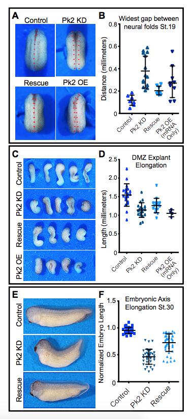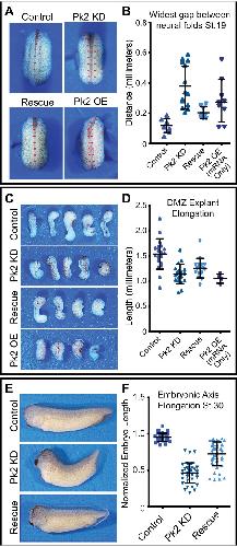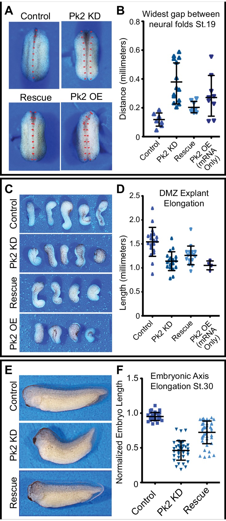 Figure 1âfigure supplement 2. Pk2 knockdown results in embryonic convergent extension phenotypes.(A) Dorsal view: stereoscope images of a representative Stage 20 control embryo, an embryo that has been injected dorsally with 25 ng Pk2 morpholino, an embryo that received morpholino plus a 400 pg GFP-Pk2 mRNA rescue dose, and an embryo that received only the 400 pg Pk2 mRNA. Anterior is up. (B) Graph of the distance between the neural folds at stage 20. n = 8 (Control), 14 (Pk2 KD), 8 (Rescue), 9 (RNA/OE). Control vs. KD, p<0.0001; vs. Rescue, p=0.0019; vs. OE, p=0.0079. (Mann-Whitney Test for significance). Error bars represent standard deviation. (C) Images of Dorsal marginal zone (DMZ) explants dissected from stage 11.5 embryos of the treated under the same conditions as in (A). (D) Graph of DMZ explant length at a time when embryos that had not been dissected had reached Stage 20. n = 19 (Control), 19 (Pk2 KD), 16 (Rescue), 4 (RNA/OE). Control vs. KD, p<0.0001; vs. Rescue, p=0.0010; vs. OE, p=0.0041. (Mann-Whitney Test for significance). Error bars represent standard deviation. (E) Representative images of Stage 30 embryos that received 30 ng Pk2 morpholino, morpholino plus 400 pg rescue GFP-Pk2 mRNA, or controls that received neither. Anterior is left and dorsal is up. (F) Graph of the length of the dorsal embryonic length of embryos represented by those shown in (E). n = 35 (Control), n = 37 (Pk2 KD), n = 44 (Rescue). Control vs. KD, p<0.0001; vs. Rescue, p<0.0001. (Mann-Whitney Test for significance). Error bars represent standard deviation. |