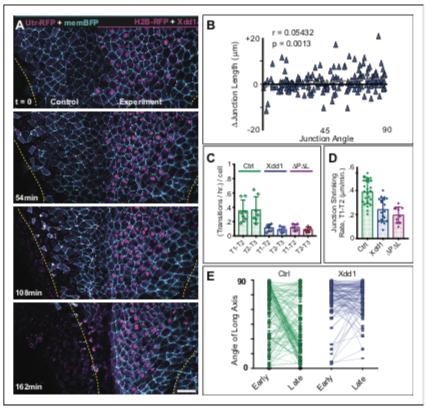 Figure 4. PCP function is required for polarized junction shrinking in the neural plate. (A) Confocal images from a Xenopus neural plate evenly labeled with membraneBFP and Utrophin-RFP (actin biosensor), but mosaically co-expressing H2B-RFP (magenta nuclei) together with Xdd1 on one side (right). The lateral boundaries of the neural plate are marked in each frame by yellow lines, demonstrating that Xdd1 expression disrupts the medial movement of the right neural fold in comparison to the control fold on the left. Scale = 50 mm (B) Graph of average angle of junctions versus junction length change for cells expressing Xdd1 to compare with control plot in Figure 3C. n = 187 junctions from four embryos across three experiments. (C) Graph with the total number of T transition events expressed as transitions per hour per the number of cells examined, with each point representing a single embryo. Error bars represent standard deviation. For statistical analysis, Control vs. Xdd1, and Control vs. Pk2-DPDL ML, p=0.0025** for both classes of transitions (Mann-Whitney Test for significance). n = 4 experiments, seven embryos, 1167 cells (Control); three experiments, five embryos, 560 cells (Xdd1); three experiments, five embryos, 841 cells (Pk2-DPDL). (D) The calculated rate of junction contraction for completed Type one to Type two transition (T1-T2) (complete contraction of a V-junction, see Figure 3Aâaâ). Error bars represent standard deviation. Ctrl vs. Xdd1, p<0.0001****, Ctrl vs. Pk2-DPDL, p<0.0001****, Xdd1 vs. Pk2-DPDL, p=0.2051. (Mann-Whitney statistical test). n = 24 junctions from four embryos across three experiments (Ctrl), n = 19, 2, 2 (Xdd1), and n = 9, 3, 3 (Pk2-DPDL). (E) Plot of the angle of the long axis of control and Xdd1-expressing cells at Stages 12â12.5 (early) and Stages 13â14 (late), with lines connecting angles of the same cell at the two different time points. All measurements are from different regions of embryos that mosaically express Xdd1, similar to as shown in (A). n = 136 control cells and 114 Xdd1-expressing cells from four embryos across three experiments. DOI: https://doi.org/10.7554/eLife.36456.012 |