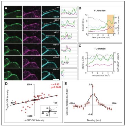 Figure 9. Spatiotemporal coordination of Prickle2 and actomyosin accumulation at shrinking junctions. (A) Confocal images of a shrinking V-junction mosaically labeled with Myl9-GFP, RFP-Pk2, and membraneBFP over the course of a 1600 s time lapse and associated intensity plot profile for each fluorophore across the length of the junction. Scale = 10 mm. (B) Plot of mean intensities over time for the V-junction in (A) which shows the pulsed co- accumulation of Pk2 (pink) and Myl9 (green) as junction length shrinks (black dashed line). The orange box marks the time points portrayed in (A) (C) Plot of mean intensities over time for a mosaically labeled T-junction showing the pulsed co-accumulation of Pk2 (pink) and Myl9 (green) as junction fluctuates between shrinking and growing (black dashed line). (D) Scatter plot of the change in RFP-Pk2 intensity against the change in GFP-Myl9 intensity and associated correlation; a magnified view of the core of this plot is shown in Panel c’. n = 96 junctions from three embryos across two experiments. (E) Cross correlation analysis of changes in RFP-Pk2 and GFP-Myl9 intensities over time, with a mean cross correlation coefficient of 0.7 at 0 s time lag demonstrating synchronous accumulation dynamics. n = 22 junctions from three embryos; error bars represent SEM. DOI: https://doi.org/10.7554/eLife.36456.024 |