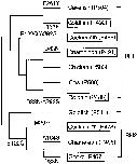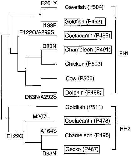 Fig. 2. A composite tree topology of selected RH1 and RH2 pigments and amino acid replacements inferred by a likelihood Bayesian method (Yang et al., 1997). The numbers after P refer to λmaxs of visual pigments. Amino acid replacements are shown next to different. The pigments with blue-shifted λmaxs are indicated by rectangles. Cavefish, Astyanax fasciatus; goldfish, Carassius auratus; coelacanth, Latimeria chalumnae; chameleon, Anolis carolinensis; chicken, Gallus gallus; bovine, Bos taurus; dolphin, Tursiops truncatus; gecko, Gekko gekko.