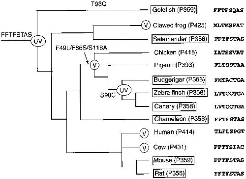 Fig. 4. A composite tree topology of selected SWS1 pigments and critical amino acid replacements at sites, 46, 49, 52, 86, 90, 3, 114, and 118, along the goldfish and avian branches. The UV pigments are boxed. UV and V indicate UV and violet sensitivities, respectively. Amino acid replacements next to the goldfish and avian branches show those at the eight critical sites. The eight letters next to the vertebrate ancestor and 13 contemporary pigments show the eight critical amino acids. Clawed frog, Xenopus laevis; pigeon, Columba livia; budgerigar, Melopsittacus undulatus; zebra finch, Taeniopygia guttata; human, Homo sapiens; mouse, Mus musculus; rat, Rattus norvegicus; and salamander, Ambystoma tigrinum. For other species, see Fig. 2.