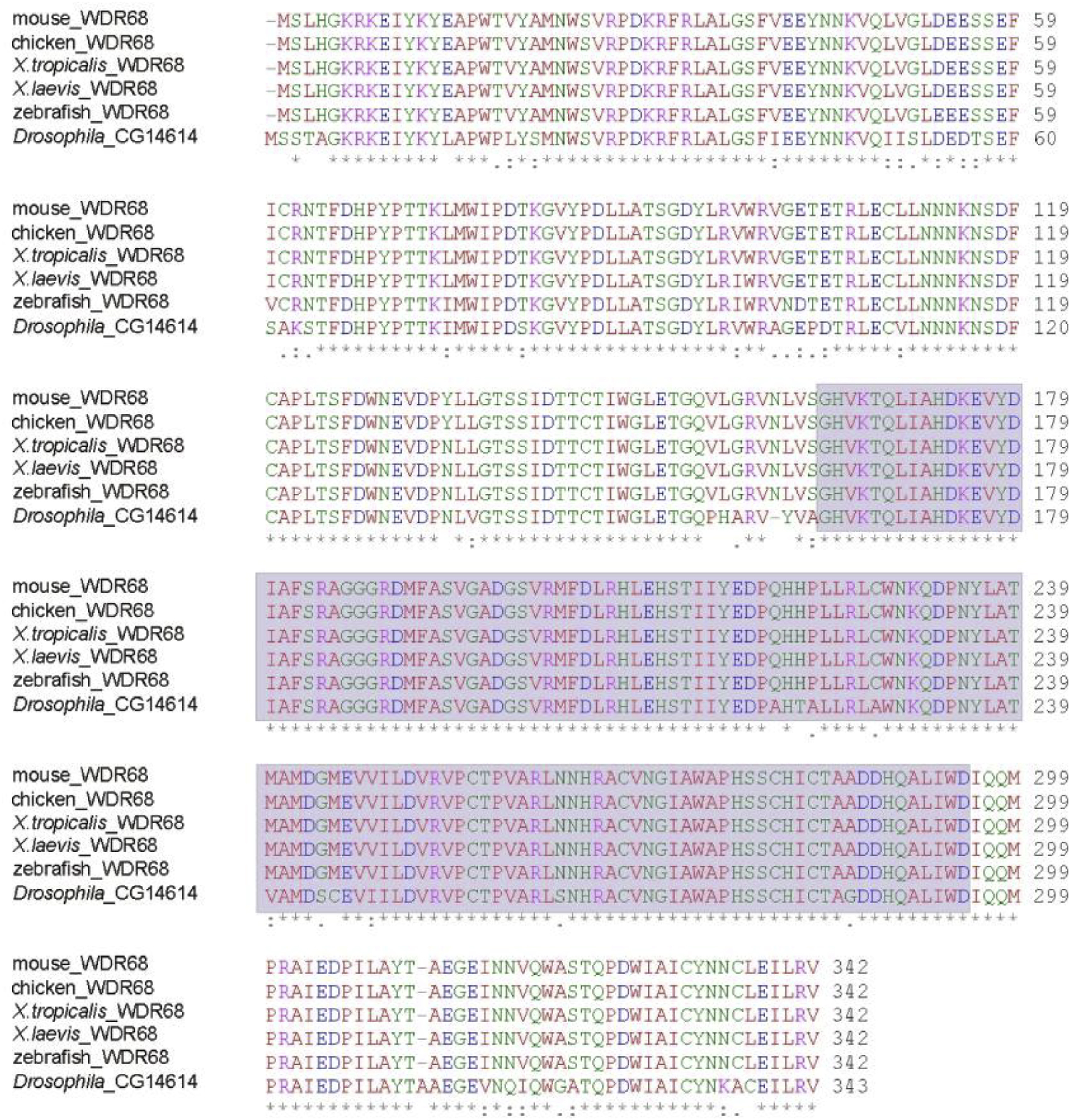 Fig. 2. Alignment of WDR68 protein sequences. The sequence characterized in the present work, corresponding to Xenopus laevis (KX910100.1), was aligned with the sequences from Xenopus tropicalis (NP_989097), zebrafish (NP_956363), chicken (NP_001072972), mouse (AAH48722) and fruit fly (AAF50953). The comparison showed a high degree of conservation of the WD40 domain, indicated by a violet box. Asterisks indicate identical amino acids between the aligned sequences; colons indicate conserved substitutions; dot indicates semi conserved-substitutions. (For interpretation of the references to color in this figure legend, the reader is referred to the Web version of this article.)