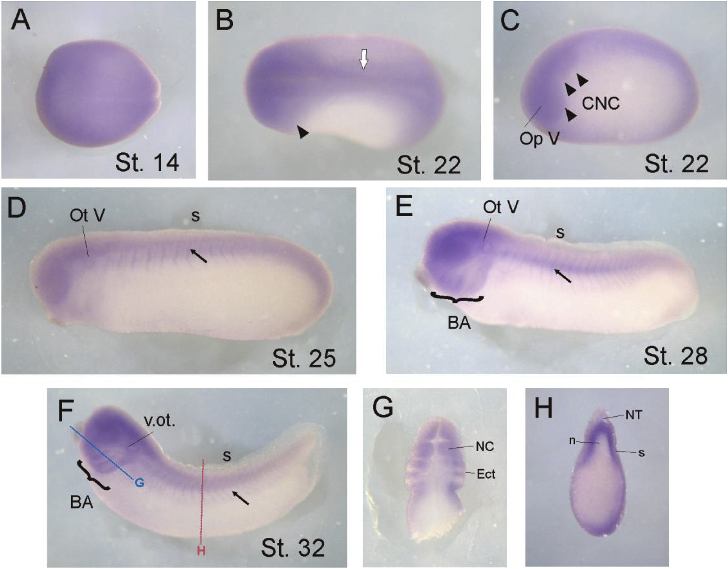 Fig. 4. Expression pattern for the wdr68 gene during Xenopus early development. (A, B) Dorsal view of embryo. (CâF) Side view. (G, H) Transverse sections. (A) wdr68 expression is ubiquitous during early stages of development. (B, C) Since the late neurula stage, there is an enrichment in its expression in the head region (black arrowhead in B), in the migratory streams of the cranial neural crest (black arrowheads in C) and in the developing somites (white arrow). (D) At stage 25, wdr68 transcripts are evident in the otic vesicle. In the somitic region (black arrow), they acquire a segmental pattern. (E, F) Since the tailbud stage, wdr68 is strongly marked in the branchial arches (brackets). (G) Front section at the level of the branchial arches (blue broken line in F). Notice that the ectodermal cell population corresponding to the neural crest expresses wdr68. (H) Transverse section at the trunk level (red broken line in F). wdr68 expression is evident on the floor of the neural tube and in somitic mesoderm. References: BA, branchial arches; CNC, cranial neural crest; Ect, ectoderm; OpV, optic vesicle; OtV, otic vesicle; n, notochord; NC, neural crest; NT, neural tube. (For interpretation of the references to color in this figure legend, the reader is referred to the Web version of this article.)