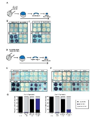 Fig. 7. SoxB1 factors cannot replace the function of SoxE factors in animal pole explants induced to a neural crest state.(A) Schematic of experimental overview for knockdown experiments. (B)In situ hybridization examining Sox9, Sox10,or FoxD3 expression in animal pole explants injected with Sox10 morpholino, Wnt8, and chordin. (C)Schematic of experimental overview for rescue experiments. (D)In situ hybridization examining FoxD3 expression in animal pole explants injected with Sox10 morpholino, Wnt8,chordin, and either Sox2 or Sox9 mRNA. (E)In situ hybridization examining FoxD3 expression in animal pole explants injected with Sox10 morpholino, Wnt8, chordin, and either Sox3or Sox10 mRNA. (F) Quantification of induction potential following SoxB1 and SoxE factor overexpression in morphant animal caps.