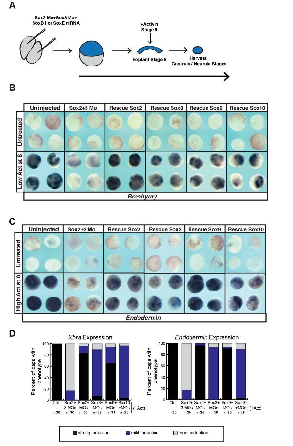 Fig. 5. SoxB1 and SoxE factors can both restore potential to animal pole explants following morpholino-mediated depletion of Sox2 and Sox3.(A) Schematic of experimental overview. (B) In situ hybridization examining Brachyury expression in animal pole explants injected with Sox2 and Sox3 morpholino and either Sox2, Sox3, Sox9 or Sox10mRNA that were cultured with or without a low dose of activin. (C)In situ hybridization examining Endoderm in expression in animal pole explants injected with Sox2 and Sox3 morpholino and either Sox2, Sox3, Sox9 or Sox10 that were cultured with or without a high dose of activin. (D) Quantification of induction potential following SoxB1 and SoxE factoroverexpression in morphant animal caps.