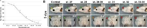 Figure 2. Eye regrowth declines with increasing age.The Regrowth Index (RI) is a measure of eye regrowth quality (Kha et al., 2018). Each regrown eye is assigned to one of four phenotypes: full (comparable to an unoperated control eye), partial (minor abnormalities with some reduction in size), weak (no lens and small size), and none (no regrowth). To obtain the RI value, the number of tadpoles in each category is multiplied by: 3 (full), 2 (partial), 1 (weak), or 0 (none), added together, and then divided by total number of tadpoles. A value of 300 denotes full regrowth in all individuals in the group whereas a value of 0 denotes no regrowth in all individuals. (A) At 5 days post surgery (dps): developmental stage. 27, RI = 281 (n> 100); st. 28 RI = 251 (n = 67); st. 29â30, RI = 159 (n = 142); st. 31, RI = 82 (n = 106); st. 32, RI = 37 (n =113); and st. 33â34, RI = 10 (n = 70). *P < 0.01, vs. st. 27. (B) Representative images showing resulting eyes at 5 dps. Corresponding top and bottom panel show side and top views of the same tadpole. (B1, B1â) Unoperated control eye indicated by yellow arrowheads. (B2, B2â) st. 27. (B3, B3â) st. 28. (B4, B4â) st. 29â30. (B5, B5â) st. 31. (B6, B6â) st. 32. (B7, B7â) st. 33â34. Green arrowheads: Full regrown eyes; orange arrowheads: partial eye regrowth; red arrowheads: no regrowth. Top panels: dorsal is up and anterior is to the left. Bottom panels: anterior is up. Scale bar: 500 µm.