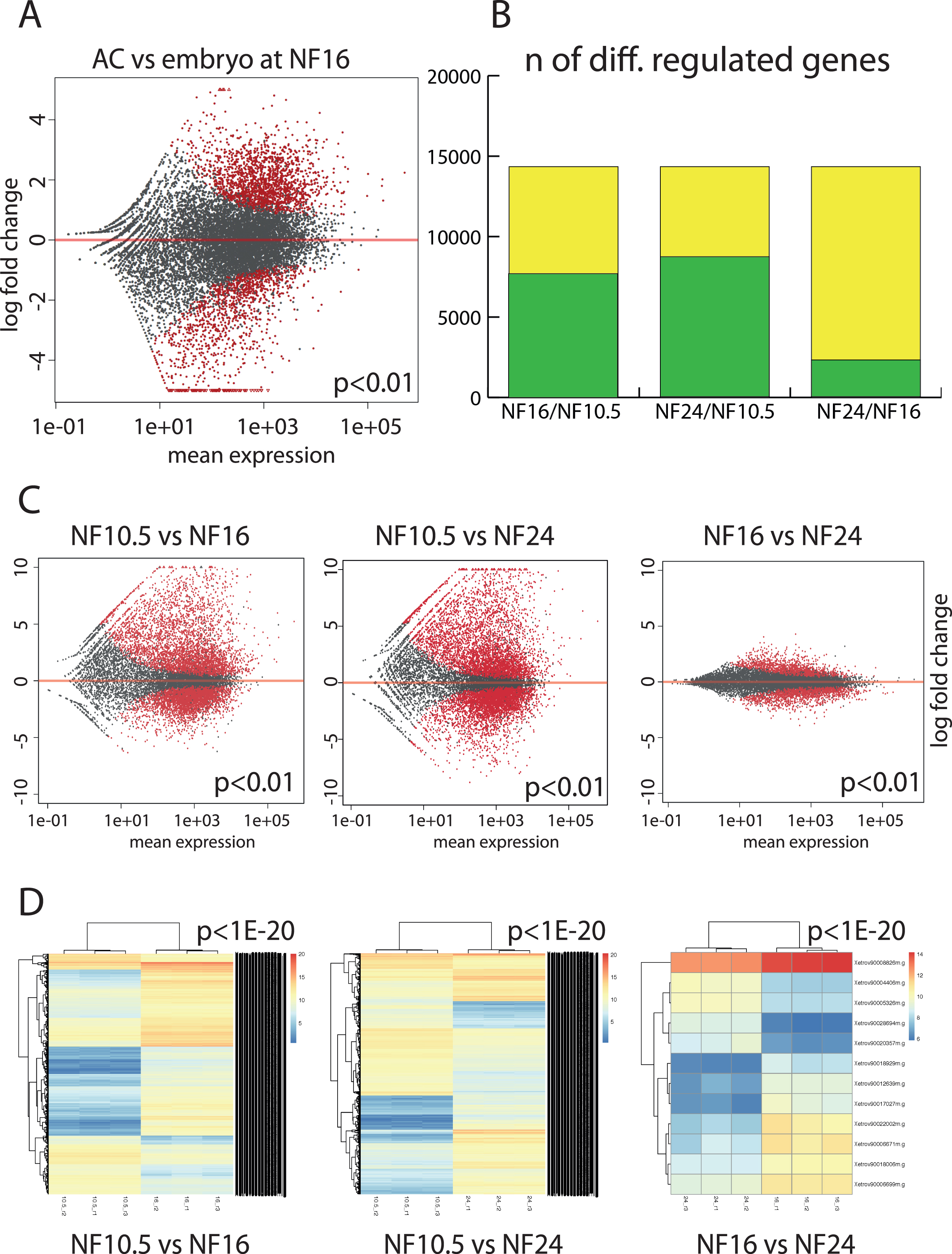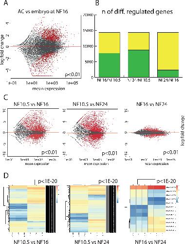 Figure 2. Comparative transcriptome analysis of epidermal differentiation. (A) Gene expression in the AC versus whole embryo at the neurula stage (NF16). Each dot represents a gene. In red, genes that are differentially expressed in a significant manner (P < 0.01), in grey genes with not-significant variation. (B) Plotting the extent of differential gene expression in AC. Yellow: total number of genes detected in the RNAseq. Green: genes that are differentially regulated between the given developmental stages (P < 0.01). The maximal number is defined by the annotated gene models present in XenTro9.1. (C) Scatter plots detailing the extent and magnitude of differential gene expression between indicated developmental stages (P < 0.01). (D) Unsupervised clustering of the differentially expressed genes from the biological replicates with a cutoff of P < 1eâ20. |