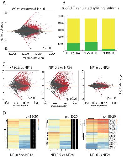 Figure 3. Epidermis-specific splicing isoforms. (A) Expression of splicing isoforms in the AC vs whole embryo at the neurula stage (NF16). Each dot represents an annotated splicing isoform. In red, splice isoforms that are differentially expressed in a significant manner (P < 0.01), in grey transcripts with not-significant variation. (B) Plotting the extent of differentially expressed splice isoforms in AC. Green: isoforms that are differentially regulated between the given developmental stages (P < 0.01). Yellow: the maximal number is defined by the annotated transcript models present in NCBI Xenopus tropicalis annotation release 103. (C) Scatter plots detailing the extent and magnitude of differential splice isoform expression between indicated developmental stages (P < 0.01). D) Unsupervised clustering of the differentially expressed splicing isoforms from the biological replicates with a cutoff of P < 1eâ20. |