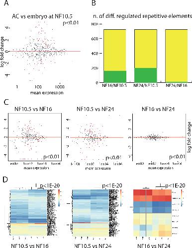 Figure 5. Transcripts from repetitive DNA elements during epidermal differentiation. ( A) Expression of RE transcripts in the AC vs whole embryo at the gastrula stage (NF10.5). Each dot represents an annotated RE transcript. RE RNAs that are differentially expressed in a significant manner (P < 0.01) are shown in red, while transcripts with not-significant variation are shown in gray. (B) Plotting the extent of differentially expressed RE-derived transcripts in AC. Green: differentially regulated RE RNAs between the given developmental stages (P < 0.01). Yellow: the maximal number defined by REPBASE 19.10. (C) Scatter plots detailing the extent and magnitude of differential RE expression between indicated developmental stages (P < 0.01). D) Unsupervised clustering of the differentially expressed RE transcripts from the biological replicates with a cutoff of P < 1eâ20. |