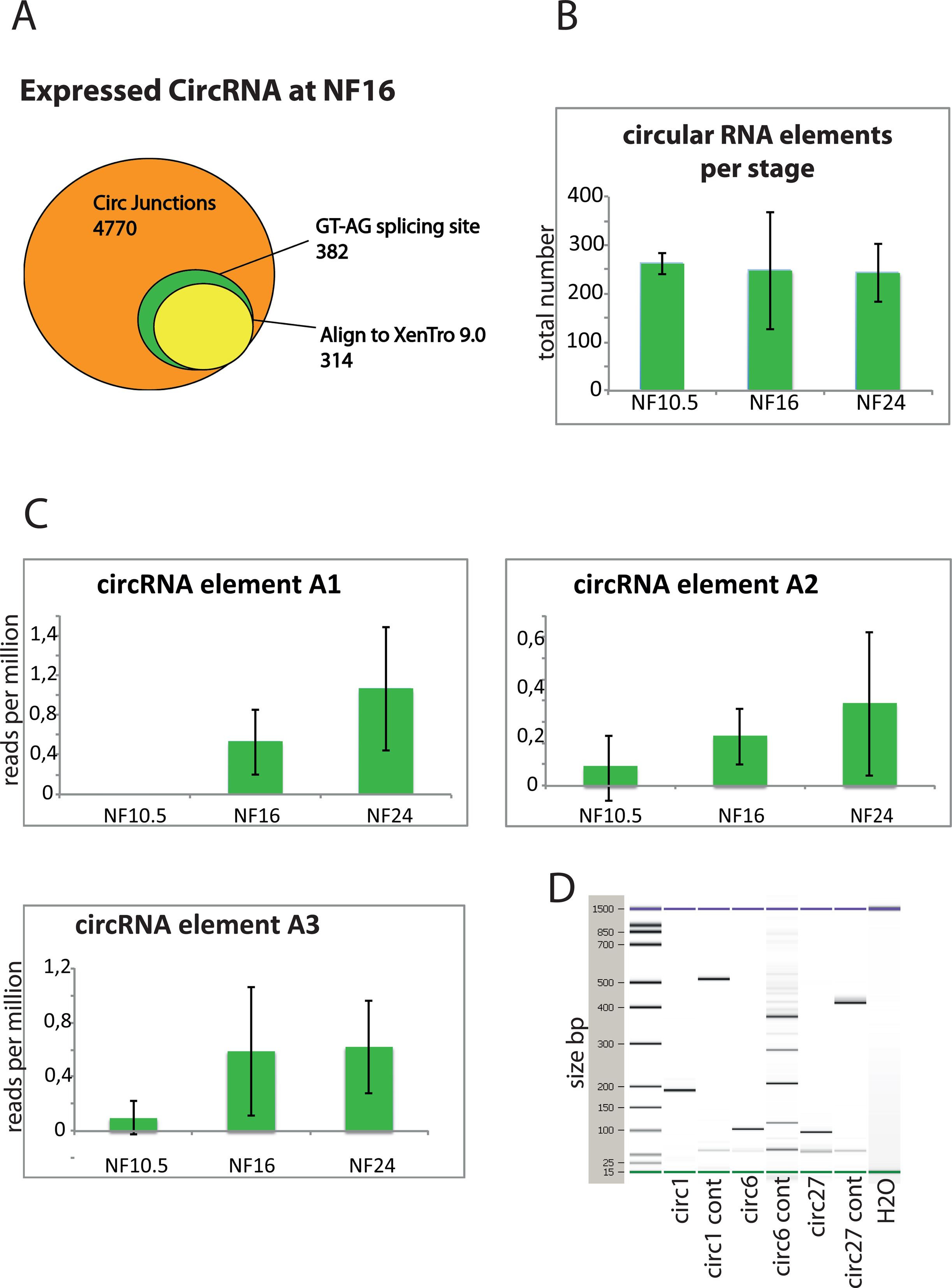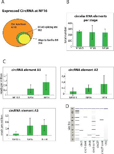 Figure 7. Analysis of circular RNAs. (A) Graphical representation of the filtered circular junctions from one single NF16 AC biological sample. (B) Total number of circRNAs detected in each developmental stage, error bars represent standard deviation. (C) Three examples of circRNAs that accumulate during the developmental timecourse. (D) Bioanalyzer gel of specific PCR-amplified circRNAs (highlighted in Supplementary Table S8). Each element has been amplified with a specific pair of primers, resulting in the predicted amplicon size (circ1 = 188bp, circ6 = 100bp and circ27 = 93bp) and a control reverse-complement primer pair, labelled as ‘cont’, which is expected to produce larger or multiple amplicons. |