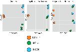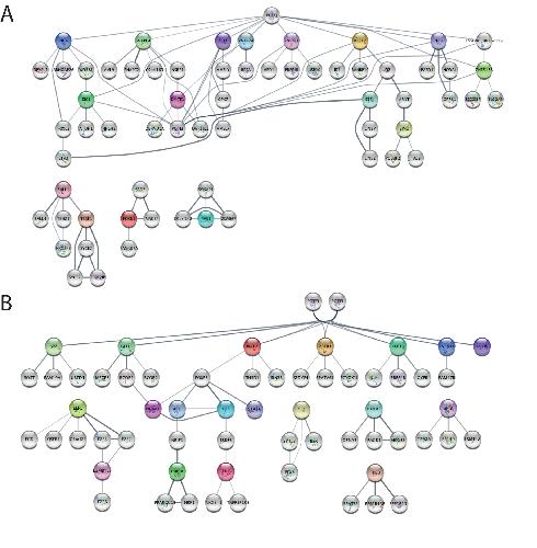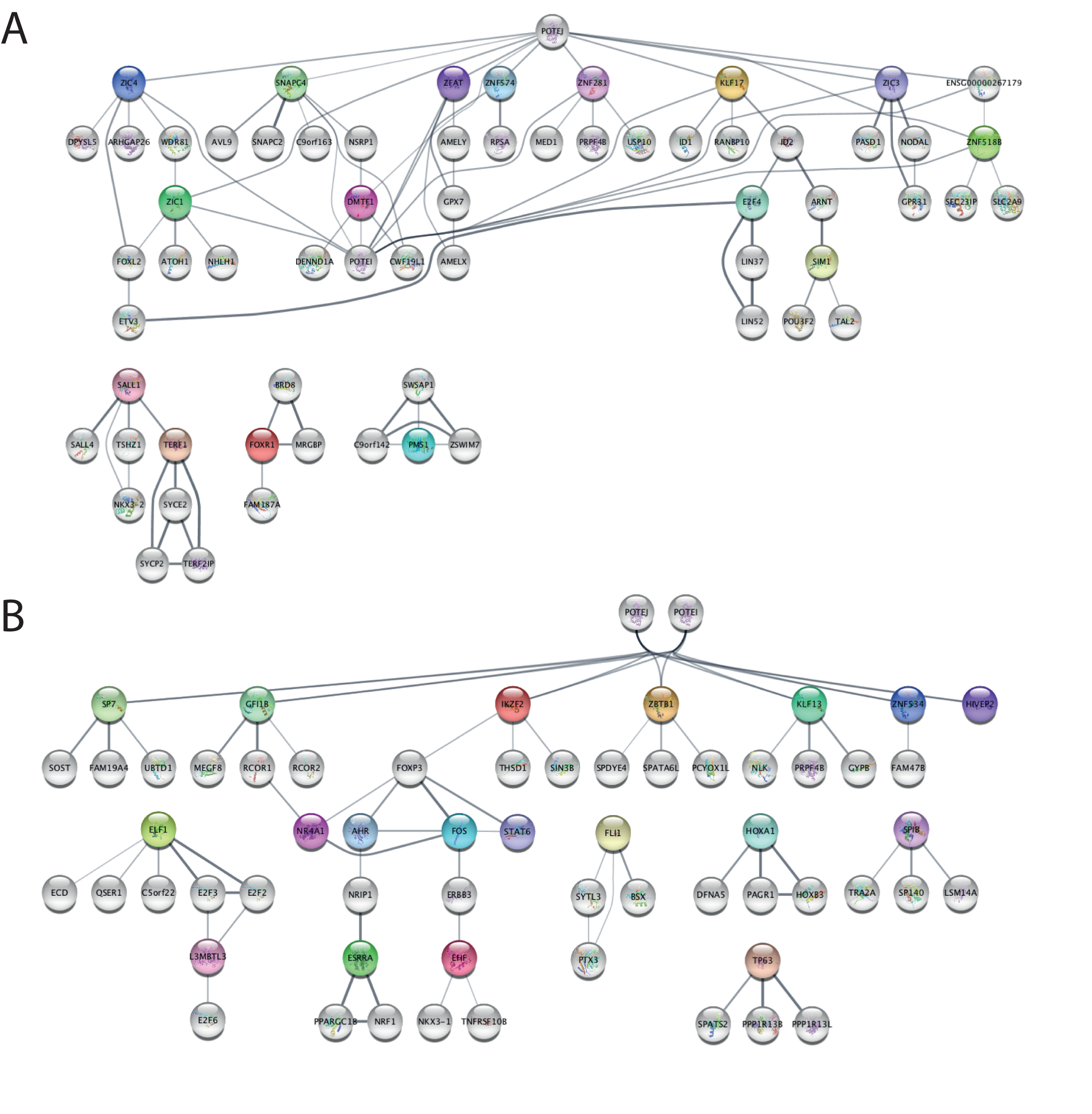 Figure 9. Transcription factor networks for the comparison of NF10.5 vs NF24 based on Mogrify. The top 15 TFs from each list (Supplementary Table S10) have been plotted for comparison. Each TF coming from our dataset appears in a coloured circle. The algorithm assembles hubs connecting all the factors using interactions deposited in the STRING database (in gray). The thickness of connecting lines is indicative of the strength of the known interaction. (A) Hubs derived from neg_rank list, naming factors specific for gastrula stage (NF10.5). (B) Hubs derived from pos_rank list, naming factors specific for tailbud stage (NF24). |