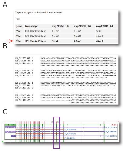 isoforms highlighting a variable region. C) Transcript and protein models derived from