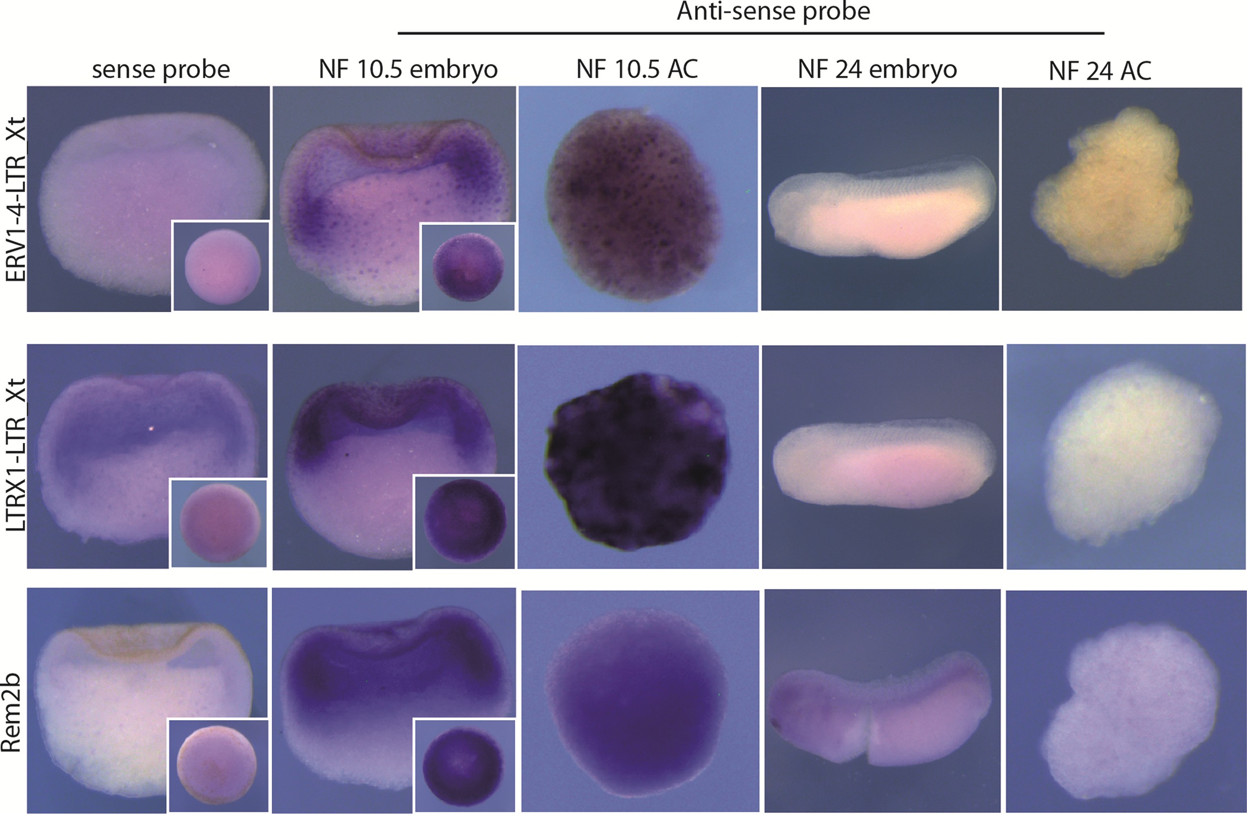 Figure 6. Region and stage-specific expression of repetitive DNA elements via RNA in situ hybridisation analysis of ERV1_4-LTR, LTRX1_LTR_Xt and Rem2b. Pictures display results from sense and antisense probe hybridisations performed and stained in parallel. Pictures of NF10.5 embryos represent sagittal sections; inserts show whole mount view of the animal hemisphere. |