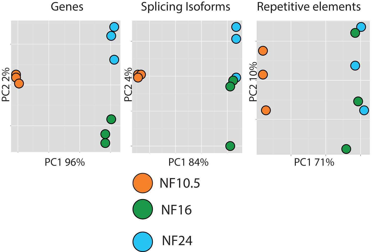 Figure 8. Prognostic value of AC transcriptomes. Principal component analysis of the AC samples for transcript classes indicated on top. Each dot represents a single biological replicate, each color represents a stage. On the X and Y-axis are plotted the first and second principal components. NF10.5 separates always very well from the other two stages. The transcriptomes of NF16 and 24 can be resolved mainly by gene expression and to less extent by RNA splicing. |