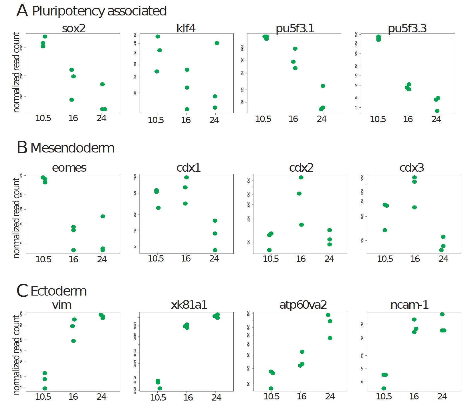 and ectodermal genes (C) was plotted at the three developmental stages as