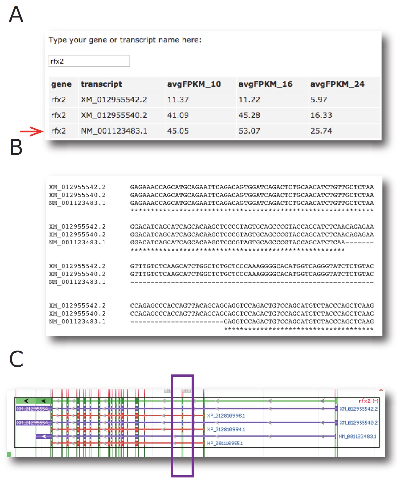 arrow indicates the Refseq transcript. B) Nucleotide alignment of the identified