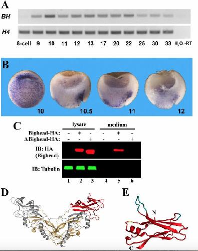 Fig. 2. Bighead is a Spemann organizer-secreted protein. (A) RT-PCR assay showing Bighead (BH) expression across different developmental stages. Histone 4 (H4) was used as a loading control. H2O and âRT served as negative controls. (B) In-situ hybridization of Bighead shows its prominent localization in the Spemann organizer in stage 10 whole embryos and stage 10.5â12 hemisected embryos. Note that there is prominent pan-endodermal localization, particularly in nuclei of the superficial yolk plug region. Embryo pictures were taken at 25à magnification. (C) Wild-type Bighead was secreted into the culture medium by transfected HEK293T cells (lane 5), while a mutant Bighead (ÎBighead) lacking the signal peptide was not (lane 6). Tubulin served as a loading control. IB, immunoblot. (D) Crystal structure of myostatin/GDF8 dimer (38), showing in red the C-terminal part of one of its prodomains that may share structural similarities with Bighead. The amino-terminal part of the myostatin prodomain is shown in gray, and the mature growth factor dimer is shown in yellow. (E) Close-up view of the conserved pro-myostatin structural domain, showing that the deletions (cyan) and insertions (yellow) found in Bighead homologs (Dataset S4) fall within loops without perturbing the β-sheet and α-helical structures. |