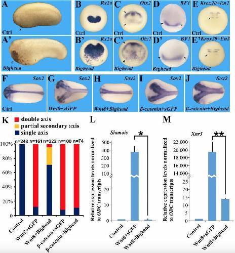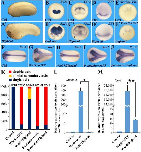 Fig 3 Bighead promotes head formation and is a Wnt antagonist. Embryos were injected four times into the animal pole with 800 pg of Bighead mRNA at the four-cell stage. All embryo pictures were taken at 25à magnification. (A and Aâ²) Bighead mRNA injection enlarges the head and cement gland at the tail bud stage; arrowheads indicate the cement gland. Ctrl, control. (BâDâ²) In situ hybridizations showing that Bighead mRNA injection expands Rx2a (88%, n = 35), Otx2 (93%, n = 28), and BF1/FoxG1 (79%, n = 48); arrowheads delimit the extent of expansion. (E and Eâ²) Wnt target gene En2 (arrowhead) at the midbrain-hindbrain border is inhibited by Bighead, whereas Krox20 marking rhombomeres 3 and 5 remains largely unaffected (92%, n = 50). (FâJ) Coinjection of Bighead mRNA inhibited xWnt8 mRNA ectopic axis-inducing activity, but not β-catenin mRNA activity, in axial duplication assays. Embryos were injected at the four-cell stage into a ventral-vegetal cell with the indicated mRNAs and collected for in situ hybridization for Sox2 at the tail bud stage. The following doses of mRNA were used: 1 pg of xWnt8, 500 pg of sGFP (a secreted form of GFP without phenotypic activity) or 500 pg of Bighead, and 80 pg of β-catenin. (K) Quantification of the experiments shown in FâJ; n indicates the number of embryos analyzed for each experimental condition. (L and M) Bighead inhibits xWnt8-induced Siamois and Xnr3 expression. Embryos were injected into the animal pole with 8 pg of xWnt8 mRNA with or without 800 pg of sGFP or Bighead mRNA into four cells at the four-cell stage. Animal caps were dissected at stage 9 and processed for RT-qPCR for the early Wnt targets Siamois (L) and Xnr3 (M). Note that Bighead significantly inhibits both Wnt targets; the experiment was performed in triplicate (*P < 0.05; **P < 0.01). |