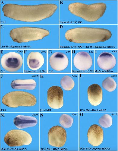 Fig 4 Bighead is required for head development in a BMP-independent way. All embryo pictures were taken at 25à magnification. (AâD) Bighead knockdown inhibits head formation, which is rescued by coinjection of MO-resistant Bighead mRNA. Embryos were injected two times dorsal-marginal at the four-cell stage as indicated and collected at the tailbud stage. The dosages for MO and mRNA were as follows: 32 ng of Bighead (L+S) MOs (directed against the L and S Bighead genes) and 800 pg of Act-HA-Bighead.S mRNA. Numbers of embryos analyzed were as follows: Controls (Ctrl), n = 153, 100% normal; Bighead MOs, n = 122, 93% with a small head phenotype; MO-resistant HA-Bighead mRNA, n = 109, 95% with a dorsalized phenotype; rescue by coinjection of MO and Bighead mRNA, n = 94, 87% rescued. (E and F) In situ hybridization for Otx2 confirming that Bighead knockdown inhibits forebrain development. Embryos were injected two times dorsal-marginal at the four-cell stage with 32 ng of Bighead MO and collected at stage 15. Ctrl, n = 35, 100% normal; Bighead mRNA, n = 48, 83% with enlarged brain phenotype. (G) Expression of the organizer marker chordin at gastrula stage 10.5. (H) Chordin expression was decreased by Bighead MOs. (I) Chordin expression was increased by injection of 800 pg of Bighead mRNA into the animal pole. Note the reduction of Chordin by Bighead MO (n = 34, 100% with phenotype) and expansion of Chordin by Bighead mRNA (n = 47, 93% with increased chordin). (JâO) Experiments with β-cateninâdepleted embryos demonstrating that Bighead is not a BMP antagonist but, instead, behaves as a Wnt antagonist. (K) Embryos were injected with 24 ng of β-catenin MO four times into the marginal-vegetal region at the two-cell stage. Then, at the four-cell stage, one dorsal-marginal cell was injected with 1 pg of xWnt8 mRNA (L), 100 pg of Chordin mRNA (M), 50 pg of Dkk1 mRNA (N), or 400 pg of Bighead mRNA (O). Embryos were collected for in situ hybridization with the neural marker Sox2 at stage 18. Note that β-catenin MO completely ventralized embryos and that only the BMP antagonist Chordin could rescue an axis. xWnt8 mRNA was entirely inactive in β-cateninâdepleted embryos, as were Dkk1 and Bighead. Numbers of embryos analyzed were as follows: J, n = 47, 100%; K, n = 52, 100% with a ventralized phenotype; L, n = 29, 100% ventralized; M, n = 34, 92% with rescued CNS; N, n = 29, 97% ventralized; O, n = 32, 97% completely ventralized. |