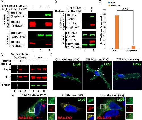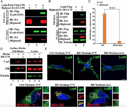 Fig. 5. Bighead binds to Lrp6 and promotes its endocytosis. (A) Bighead bound to the Lrp6 extracellular domain. CM for a secreted form of LRP6 ectodomain-Flag and Bighead-Fc-HA was allowed to bind as indicated, and subjected to protein A/G agarose pull-down followed by immunoblotting (IB). Total protein expression in the CM was confirmed by IB of the input. (B) Bighead also bound to full-length Lrp6. HEK293T cells transfected with full-length Lrp6-Flag were incubated with control or Bighead-Fc-HA CM for 3 h, and cell lysates were subjected to protein A/G agarose pull-down followed by IB. Total protein expression in the lysate was confirmed by IB of 5% of the input. Tubulin served as a cell lysate loading control. (C) Bighead (BH) protein inhibits Wnt3a protein-induced β-cateninâactivated reporter (BAR) reporter expression. HEK293T BAR-Luc/Renilla stably transfected cells were pretreated with or without BH-Fc-HA affinity-purified protein for 6 h, and 100 ng/mL Wnt3a protein was then added to the CM. Cells were further cultured for 16 h, and Luciferase/Renilla activity was measured. The experiment was performed in triplicate, and data are represented as the mean ± SD after normalization to Renilla activity (***P < 0.005). Ctrl, control. (D) BH treatment reduces cell-surface levels of endogenous Lrp6. HEK293T cells were treated with control or BH CM for 1 h at 37 °C, and endogenous cell surface proteins were labeled with sulfo-NHS-SS-Biotin on ice for 30 min. Cell lysates were subjected to pulldown with Streptavidin-agarose beads followed by IB. Total protein expression in the lysate was confirmed by IB of the input. Transferrin Receptor (TfR) was used as a control receptor that is recycled independent of the Wnt pathway. Tubulin served as a loading control. Note that BH reduced cell surface Lrp6, but not TfR (compare lanes 2 and 3). The dashed line indicates noncontiguous lanes. (E) BH induces LRP6 endocytosis. HeLa cells transfected with LRP6-Flag were treated with Ctrl or BH CM for 1 h at 4 °C or 37 °C as indicated, and processed for immunofluorescence. Arrowheads indicate internalized Lrp6+ vesicles. Note that BH induced Lrp6+ vesicles at 37 °C, but not at 4 °C. Another Lrp6 endocytosis experiment is presented in SI Appendix, Fig. S6D. (Scale bar: 20 μm.) (F) BH induces Lrp6 internalization into endolysosomes. HeLa cells transfected with LRP6-Flag were preincubated with BSA-DQ. Cells were then treated with Ctrl or BH CM for 1 h at 37 °C or 4 °C as indicated. Cells were processed for immunofluorescence. (Scale bar: 20 μm.) Squared areas are shown in individual channels as enlarged Insets (1.5à digital enlargement) on the right of each immunofluorescence panel. Note that Lrp6 was endocytosed into lysosomes containing BSA-DQ internalized from the culture medium and that Lrp6 vesicles were eliminated on ice, which prevents endocytosis. |