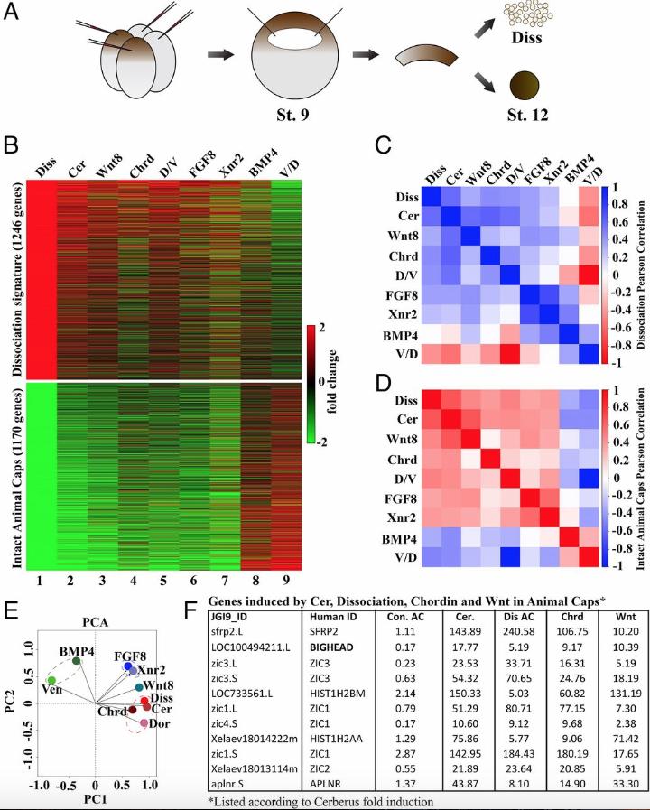 Fig. 1. Transcriptome analysis of stage 12 animal cap explants. (A) Illustration of mRNA injection four-cell and animal cap excision at stage (St.) 9. Animal caps were cultured until St. 12 and collected for RNA-seq with or without cell dissociation (Diss). (B) Heat map showing fold changes of the cell dissociation and atypical epidermis signatures. Atypical epidermis corresponds to uninjected animal caps cut at stage 9 and cultured until stage 12; these controls and the dissociated cells correspond to experiment 1 shown in Dataset S1 and are from the same experiment. These gene signatures were also compared with Cerberus, Wnt8, Chordin, FGF8, or BMP4 mRNA-injected animal caps, or with D/V half-embryos derived from the same clutch of embryos. V/D, ventral/dorsal. Rows and columns were left unclustered. Note that many genes induced by dissociation were induced in all conditions, except for BMP4 mRNA-injected animal caps and ventral halves. Genes in the atypical epidermis signature were only induced by BMP4 injection and in ventral halves. A correlation matrix of the animal cap dissociation (C) and atypical epidermis signatures in the RNA-seq libraries (D) are shown. Correlation scores were calculated as Pearson correlation coefficients and color-coded as shown in the scale bar on the right of the panel. These results show that the animal cap signatures obtained via RNA-seq readily distinguish neural- and epidermal-inducing conditions. (E) Dissociation signature examined via PCA to analyze dimensionality in nine experimental conditions (BMP/con AC, Ven/Dor, FGF8/con AC, Xnr2/con AC, Wnt8/con AC, Cer/con AC, Diss/con, Dor/Ven, and Chrd/con AC). AC, animal cap; con, control; Dor, dorsal; Ven, ventral. Each axis represents a principal component (PC1 and PC2), with the first one showing the most variation. PCA clustered epidermal-forming conditions (Ven and BMP), neural-inducing conditions (Diss, Cer, Chrd, and D/V), and mesoderm-forming conditions (FGF8 and Xnr2) without systemic bias. Note that epidermal and dissociation conditions lie on opposing quadrants, indicating the greatest differences. (F) Table of genes induced by Cer mRNA, dissociation, Chrd mRNA, and Wnt mRNA in animal caps listed according to Cerberus fold induction. Because Bighead was induced in all neuralizing conditions and ranked second in the list, it was chosen for further analysis. |