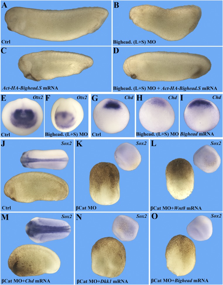 Fig. 4. Bighead is required for head development in a BMP-independent way. All embryo pictures were taken at 25à magnification. (AâD) Bighead knockdown inhibits head formation, which is rescued by coinjection of MO-resistant Bighead mRNA. Embryos were injected two times dorsal-marginal at the four-cell stage as indicated and collected at the tailbud stage. The dosages for MO and mRNA were as follows: 32 ng of Bighead (L+S) MOs (directed against the L and S Bighead genes) and 800 pg of Act-HA-Bighead.S mRNA. Numbers of embryos analyzed were as follows: Controls (Ctrl), n = 153, 100% normal; Bighead MOs, n = 122, 93% with a small head phenotype; MO-resistant HA-Bighead mRNA, n = 109, 95% with a dorsalized phenotype; rescue by coinjection of MO and Bighead mRNA, n = 94, 87% rescued. (E and F) In situ hybridization for Otx2 confirming that Bighead knockdown inhibits forebrain development. Embryos were injected two times dorsal-marginal at the four-cell stage with 32 ng of Bighead MO and collected at stage 15. Ctrl, n = 35, 100% normal; Bighead mRNA, n = 48, 83% with enlarged brain phenotype. (G) Expression of the organizer marker chordin at gastrula stage 10.5. (H) Chordin expression was decreased by Bighead MOs. (I) Chordin expression was increased by injection of 800 pg of Bighead mRNA into the animal pole. Note the reduction of Chordin by Bighead MO (n = 34, 100% with phenotype) and expansion of Chordin by Bighead mRNA (n = 47, 93% with increased chordin). (JâO) Experiments with β-cateninâdepleted embryos demonstrating that Bighead is not a BMP antagonist but, instead, behaves as a Wnt antagonist. (K) Embryos were injected with 24 ng of β-catenin MO four times into the marginal-vegetal region at the two-cell stage. Then, at the four-cell stage, one dorsal-marginal cell was injected with 1 pg of xWnt8 mRNA (L), 100 pg of Chordin mRNA (M), 50 pg of Dkk1 mRNA (N), or 400 pg of Bighead mRNA (O). Embryos were collected for in situ hybridization with the neural marker Sox2 at stage 18. Note that β-catenin MO completely ventralized embryos and that only the BMP antagonist Chordin could rescue an axis. xWnt8 mRNA was entirely inactive in β-cateninâdepleted embryos, as were Dkk1 and Bighead. Numbers of embryos analyzed were as follows: J, n = 47, 100%; K, n = 52, 100% with a ventralized phenotype; L, n = 29, 100% ventralized; M, n = 34, 92% with rescued CNS; N, n = 29, 97% ventralized; O, n = 32, 97% completely ventralized. |