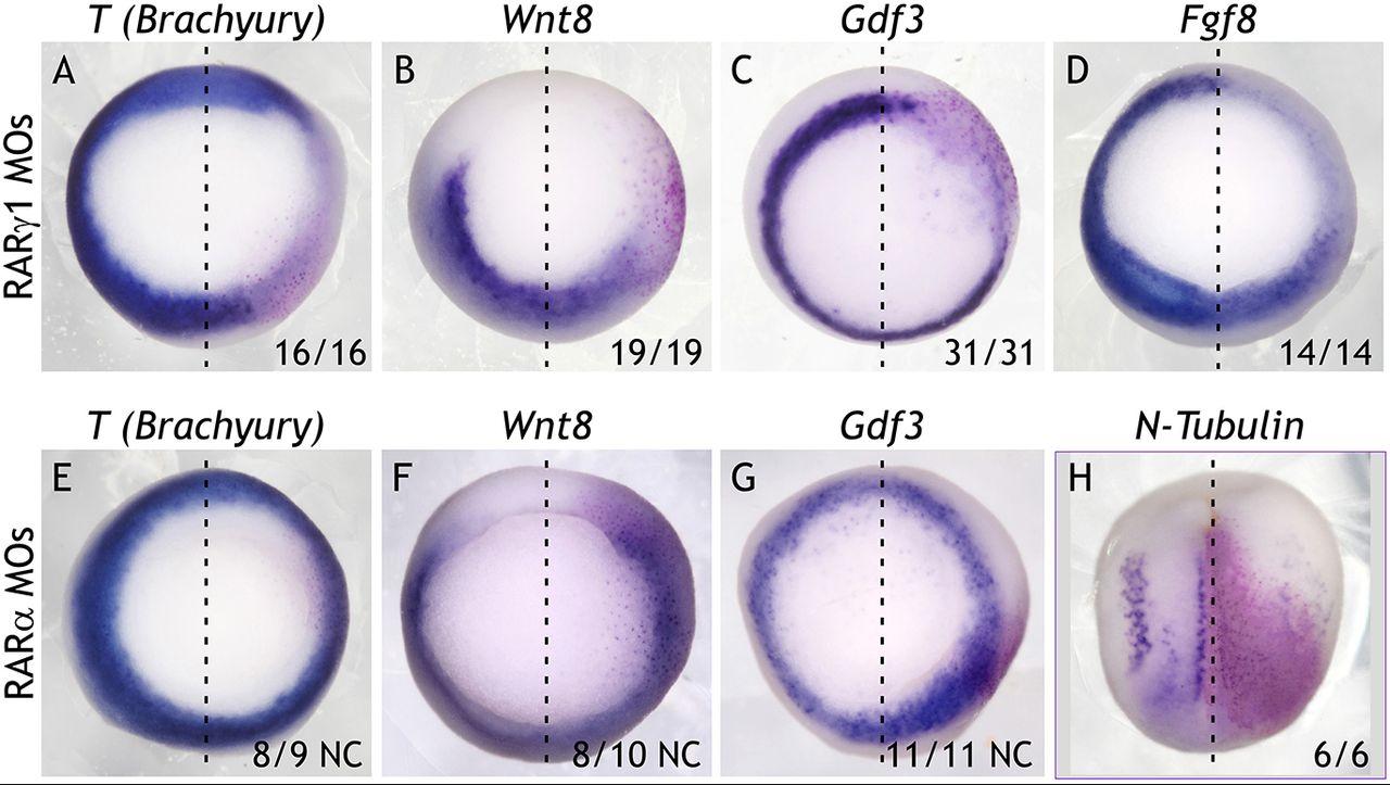 ng RARα2 MOs (Janesick et al., 2013). Injected side is to the right of the dashed line, and is indicated by the magenta β-gal lineage tracer. RARα2 MOs did not affect T, wnt8 or gdf3 expression, but did produce loss of N-tubulin as previously published (Janesick et al., 2013). All embryos, except in H, are shown in vegetal view at stage 10.5/11. H is shown in dorsal view, with anterior on the bottom at stage 14. Fractions represent the portion of embryos displaying the phenotype. NC, no change. |