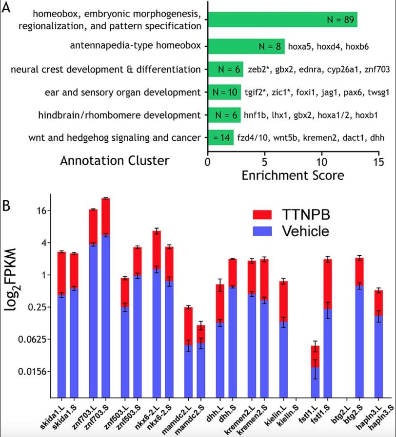 µM TTNPB-treated embryos (q<0.05, FPKMVEH>0.1) conducted in DAVID (Huang da et al., 2009a, b). Gene symbols from Xenopus were used as input, and GO terms were derived from human (for better annotation). Enrichment score is measured by Fisher's exact statistics by the DAVID server. *zic1 is a downregulated gene, and zeb2, tgif2 are <1.5-fold activated by TTNPB. (B) TTNPB-induced genes selected for further analysis in mesoderm development. Activation by TTNPB (represented as log2FPKM) is mapped for both .L and .S subgenomes (Matsuda et al., 2015; Session et al., 2016). kielin and btg2 are not found in .S and .L, respectively; hapln.S is not detected by RNA-seq. |