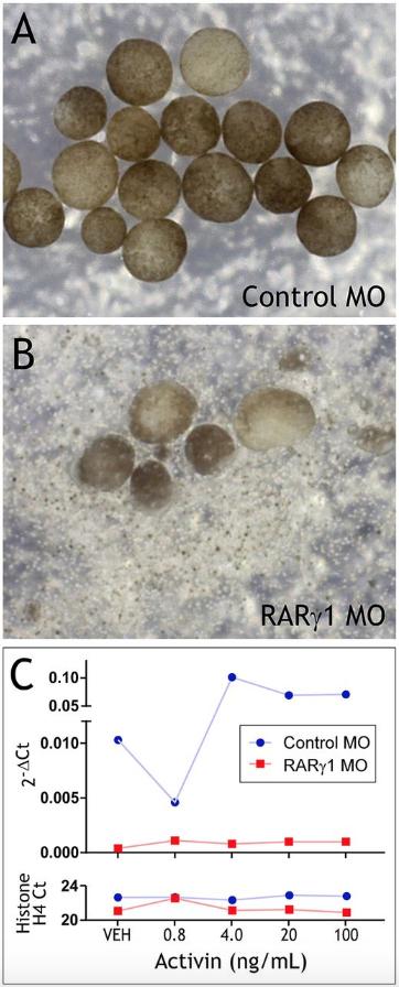ng/ml) overnight. (A,B) RARγ1 MOs result in animal cap dissociation (note the large number of single cells) (B), compared with control MO (A) in all treatment conditions. This effect was replicated in three separate experiments. mRNA was harvested 8â