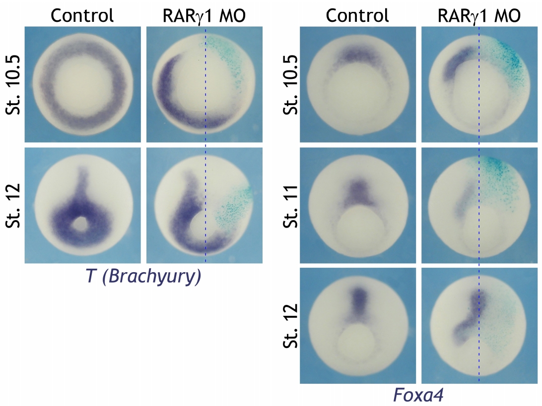 Embryos were microinjected unilaterally at the 2-cell or 4-cell stage with 10ng RARγ.L/S MO (see Fig S3). Injected side is to the right of the dotted line, and is indicated by the turquoise β-gal lineage tracer. RARγ1 MO results in the loss of T (Brachyury) and Foxa4. |
