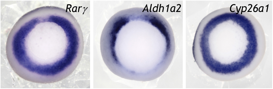 Supplemental Figure S2. Whole mount in situ hybridization showing the expression of Rarγ,Aldh1a2, and Cyp26a1 at stage 10.5/11, vegetal view, dorsal lip at the top. |