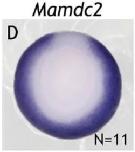 mamdc2 (MAM domain containing 2) gene expression in Xenopus laevis embryo, assayed via in situ hybridization, NF stage 10.5, vegetal view, dorsal up. |