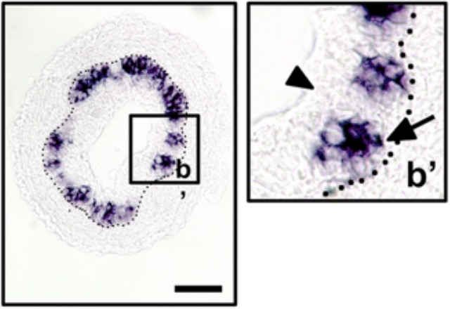 myc (MYC proto-oncogene, bHLH transcription factor ) gene expression in the intestine of Xenopus laevis embryo, assayed via in situ hybridization, NF stage 61/62, in cross-section.