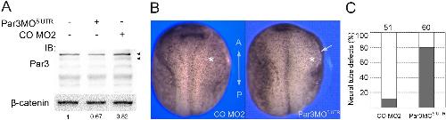 Figure 2âfigure supplement 1 Depletion of Par3 with Par3MO5âUTR causes neural tube closure defects. (A) Four-to eight-cell embryos were injected with Control MO2 (CO MO2) and Par3MO5âUTR into each of the animal blastomeres (10 ng per blastomere). Ectoderm explants (animal caps) were prepared from the injected embryos at midblastula stages. The explants were lysed at the equivalent of stage 14 for immunobloting with anti-Par3 and anti-β-catenin antibodies. The decrease in the intensity of two bands is observed in Par3MO5âUTR but not CO MO2 injected explants (arrowheads); β-catenin is a control for loading. Band intensity ratios of the highest molecular weight Par3 isoform to β-catenin are shown. This ratio is set to one in uninjected explants. (B) Eight-cell embryos were unilaterally injected into two animal blastomeres with CO MO2, 20 ng, or Par3MO5âUTR, 20 ng, as indicated. Dorsal view is shown, and the anteroposterior (AP) axis of the neural plate is indicated. (B, C) Par3 depletion results in neural tube defects. Arrow points to the open neural fold, asterisk indicates the injected side. (C) Frequencies of neural tube defects were scored by the lack of neural fold formation at the injected side. Numbers of scored embryos per group are shown above each bar. Data are representative of two experiments. |