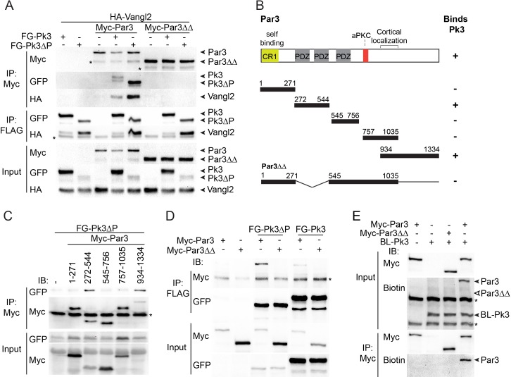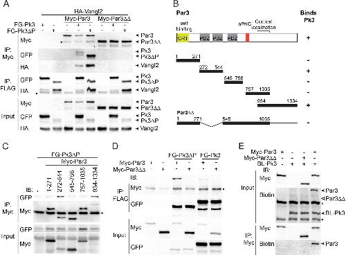 Figure 4. The association of Par3 with the Pk3/Vangl2 complex and the identification of Pk3-interacting domains.(A) HEK293T cells were transfected with Par3, Pk3 or Pk3âPET (Pk3âP) and Vangl2 constructs as indicated. Sequential pulldowns of protein complexes containing Myc-Par3, FLAG-GFP(FG)-Pk3 or FG-Pk3âP and HA-Vangl2 with Myc-Trap and anti-FLAG (M2) beads are shown. Note that Par3 binds Vangl2 only in the presence of Pk3 or Pk3âP. Asterisks mark nonspecific bands. (B). Schematic showing the Par3 constructs used in these experiments and the summary of Par3 binding. (C) Co-immunoprecipitation of Myc-Par3 constructs with FG-Pk3âP (see Figure 3 legend). (A sterisk indicates IgG heavy chain. (D) Pulldowns of FG-Pk3âP or wild type FG-Pk3 with Myc-Par3 or Myc-Par3ââ. Asterisk shows a nonspecific band. (E) Interaction of Par3 and Pk3 assessed by proximity biotinylation in Xenopus embryos. Exogenous Par3 but not Par3ââ is biotinylated by BL-Pk3. Black arrowheads point to biotinylated Par3 and BL-Pk3, and white arrowheads indicate the expected position of Par3ââ. Asterisks indicate endogenous proteins detected by anti-biotin antibodies. Protein levels are shown by immunoblotting with anti-Myc, anti-HA, anti-GFP and anti-biotin antibodies as indicated. |